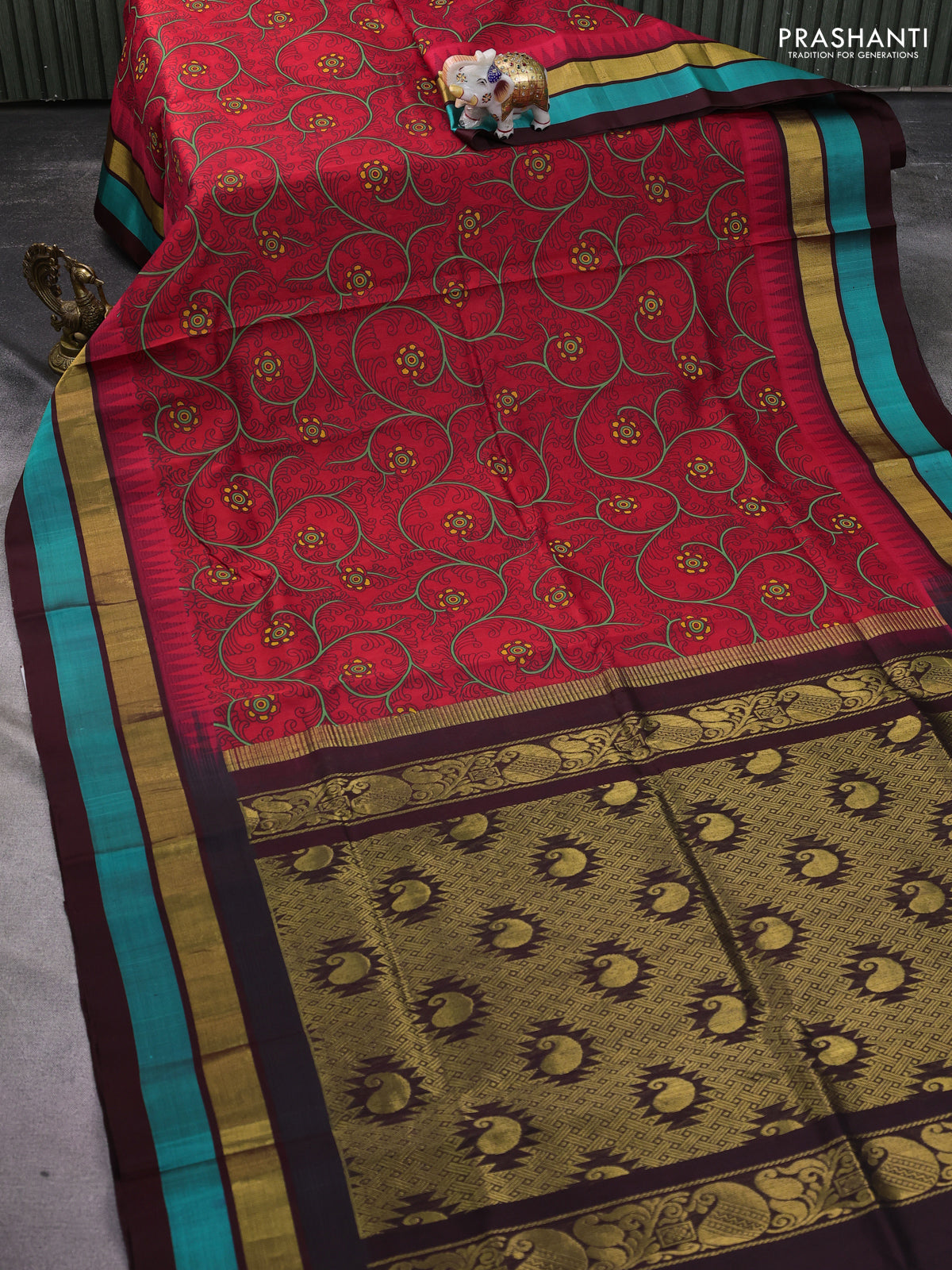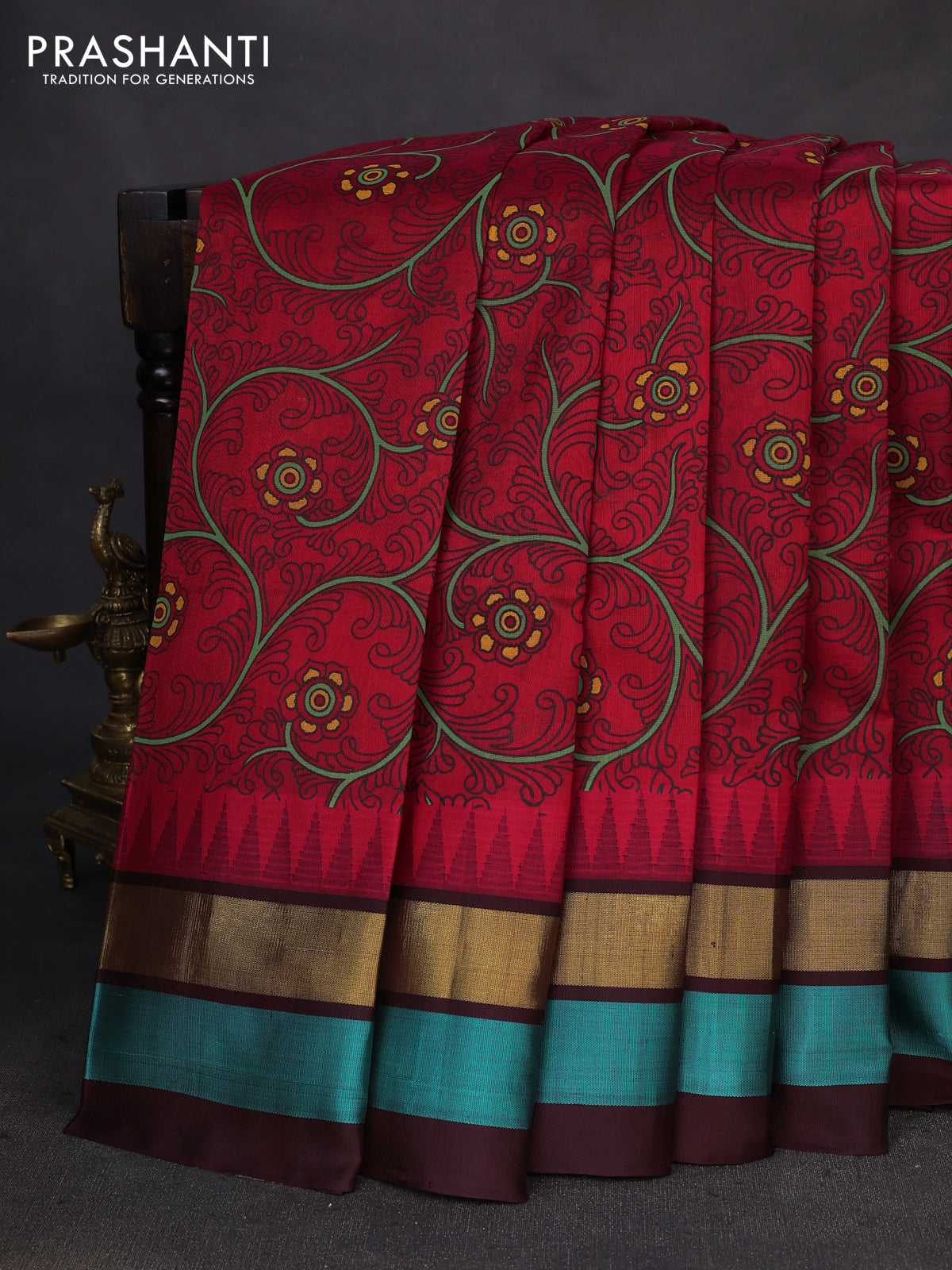 Silk cotton saree red and coffe brown with allover kalamkari prints and temple design zari woven simple border