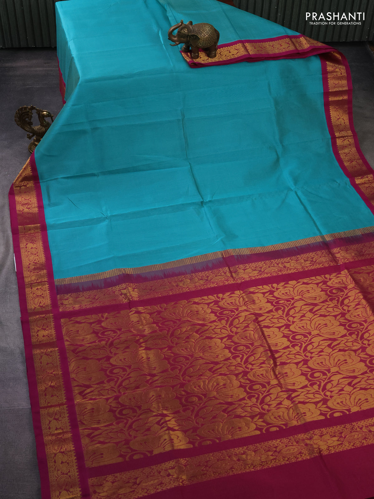 Silk cotton saree teal blue and magenta pink with allover vairaosi pattern and zari woven korvai border