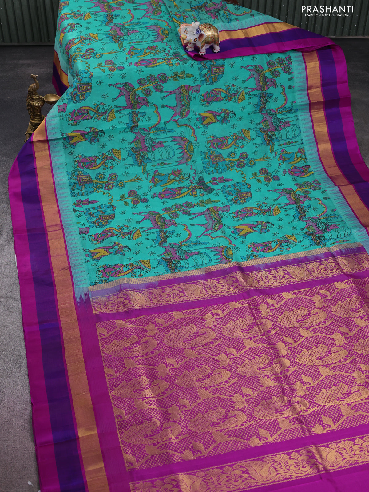 Silk cotton saree teal blue and purple with allover kalamkari prints and temple design zari woven simple border