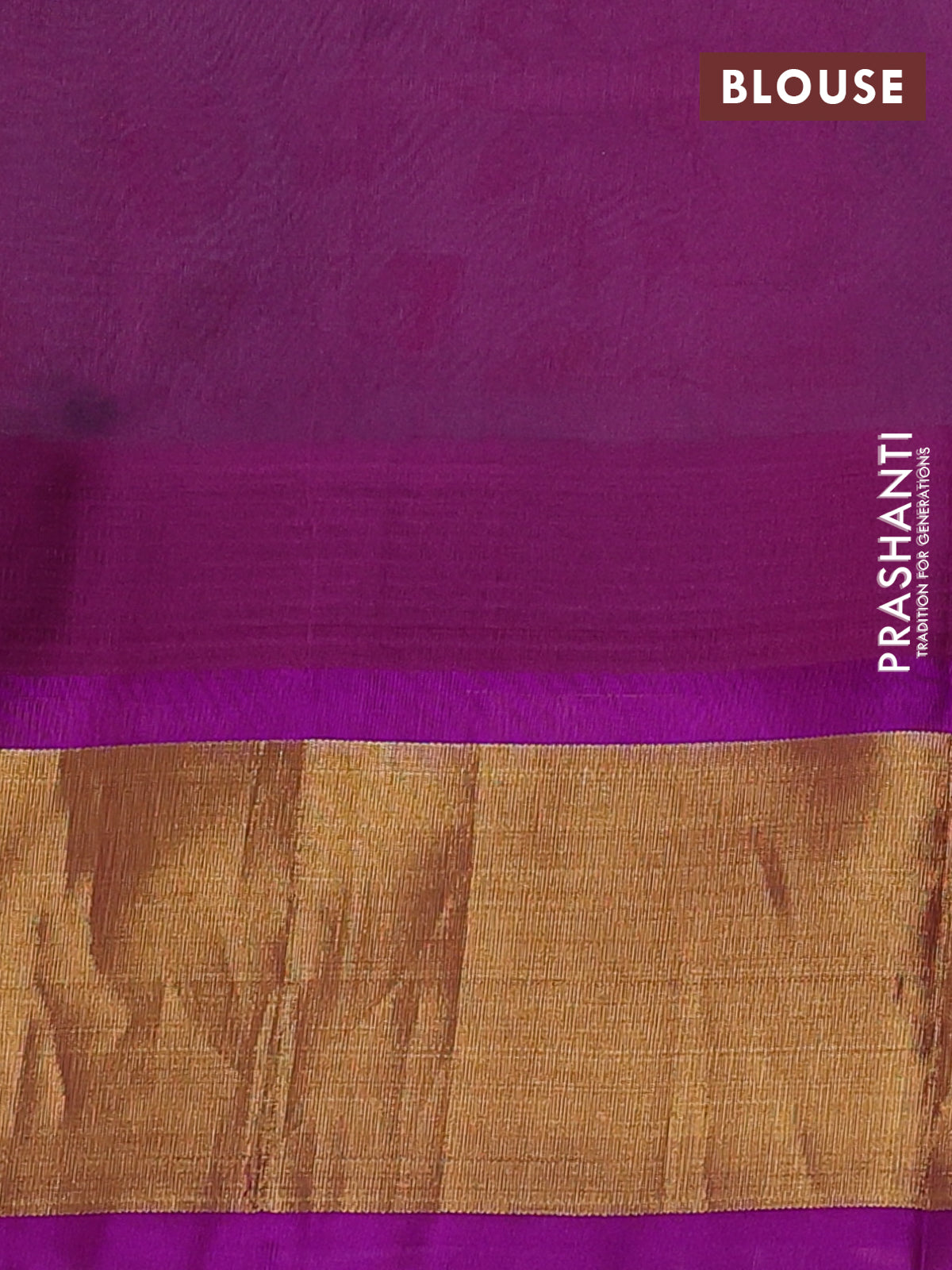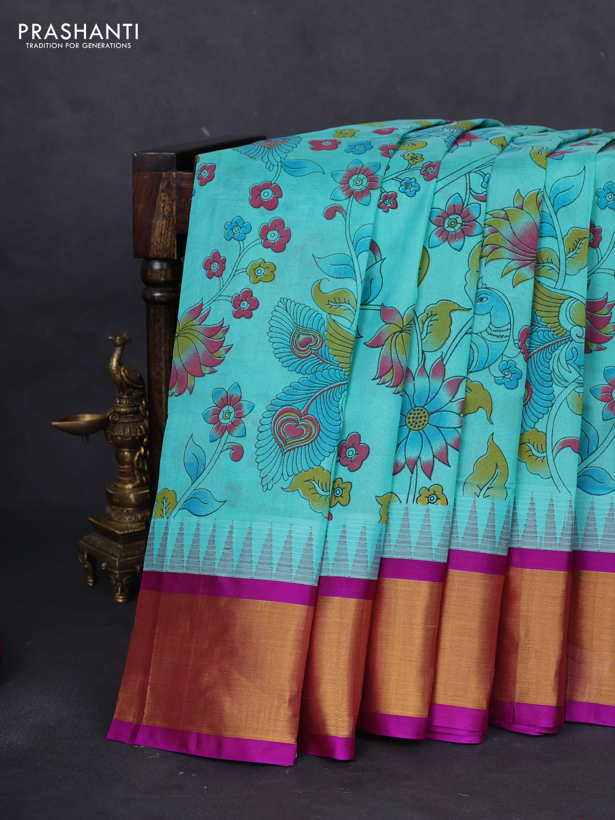 Silk cotton saree teal blue and purple with allover kalamkari prints and temple design zari woven simple border
