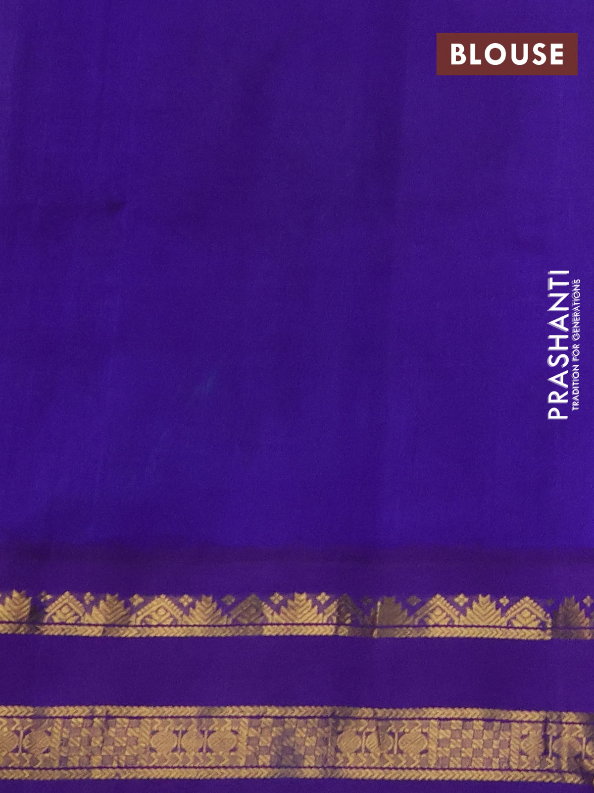 Silk cotton saree teal blue and violet with allover kalamkari prints and rettapet zari woven korvai border