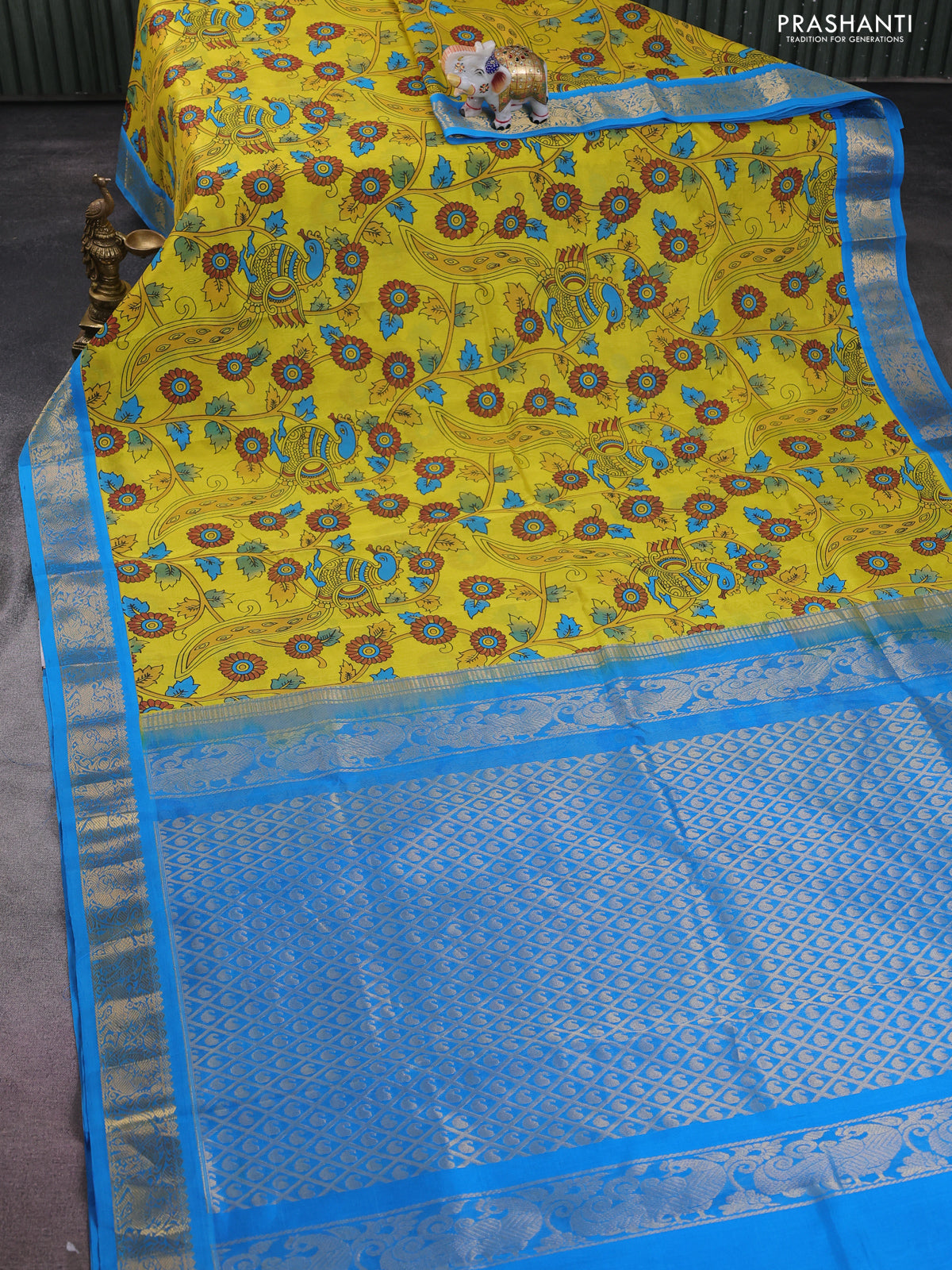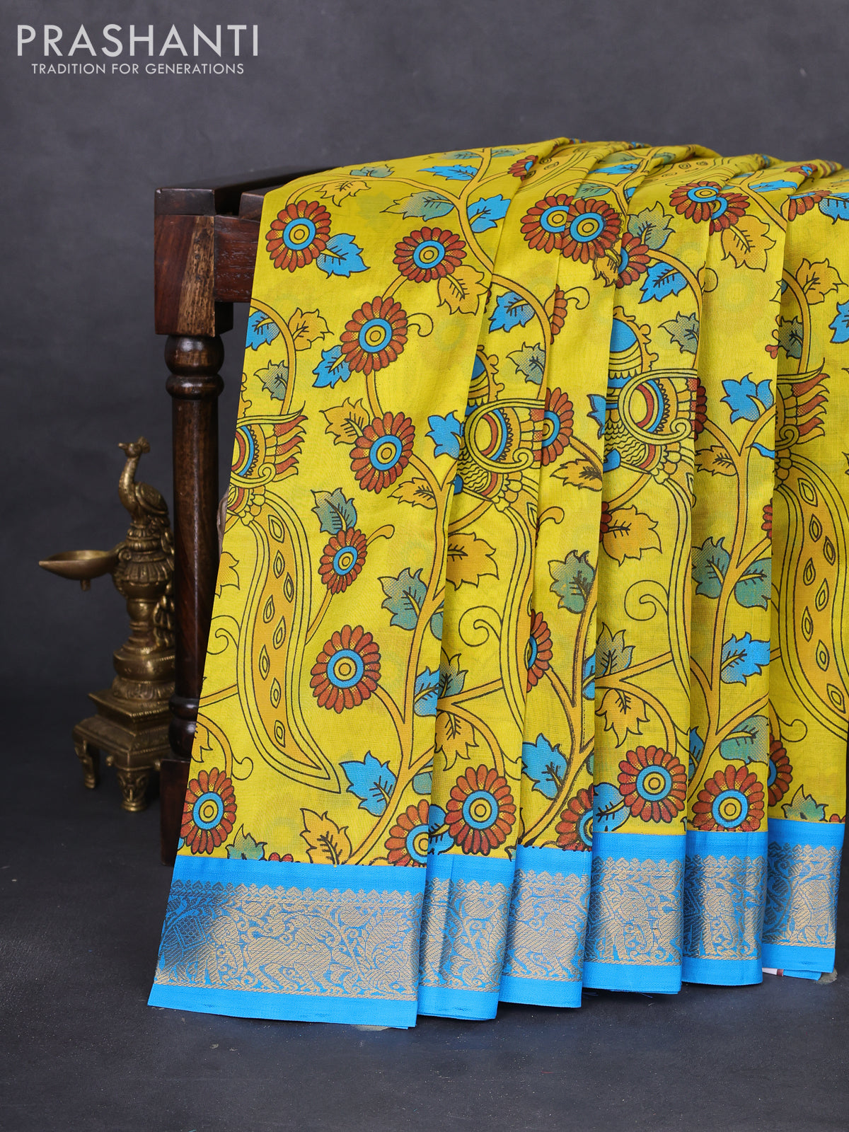 Silk cotton saree yellow and cs blue with allover kalamkari prints and zari woven korvai border