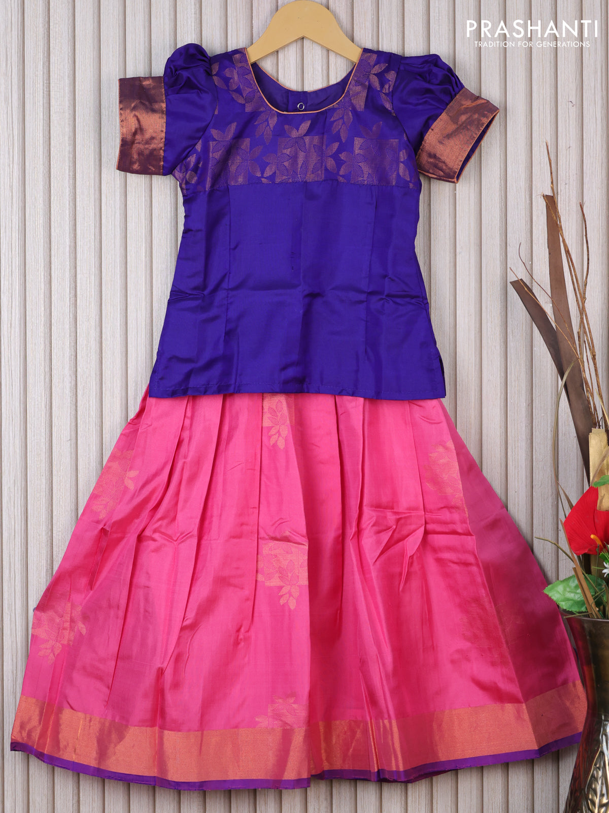 Silk kids lehenga blue and pink with patch work neck & zari buttas and woven buttas & zari woven border for 5 years