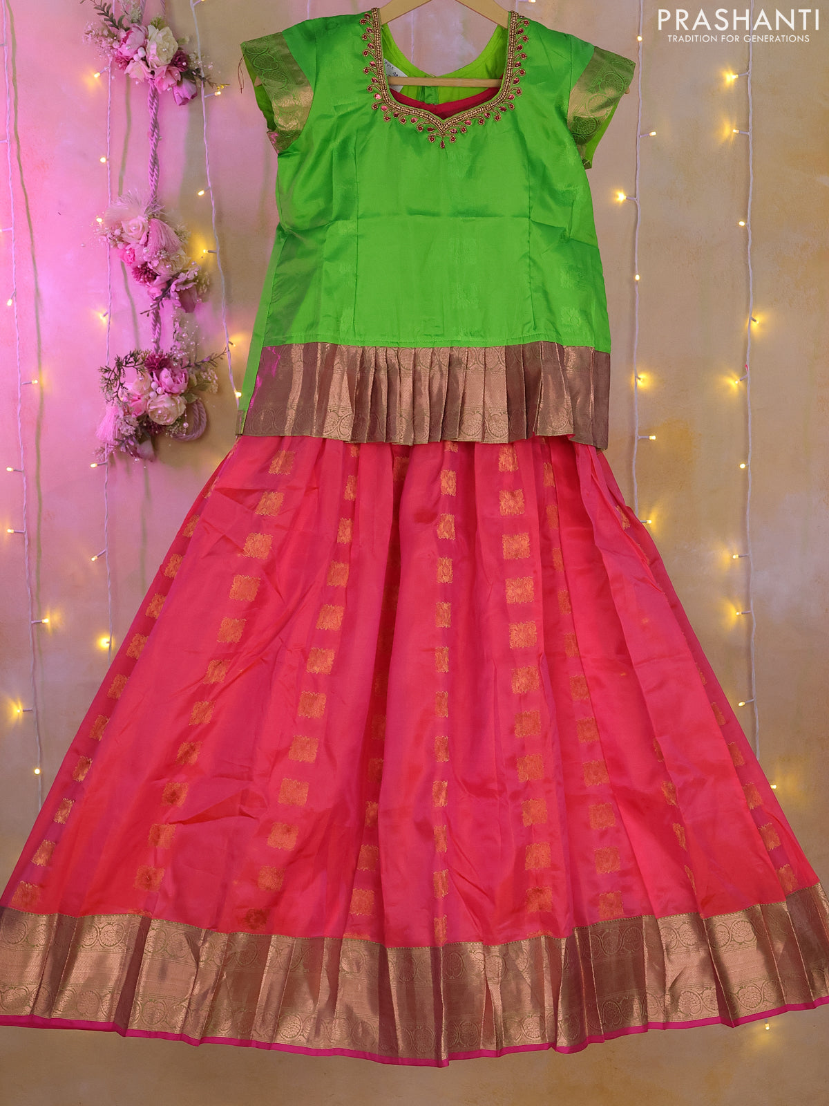 Silk kids lehenga light green and dual shade of pink with aari work neck pattern and copper zari buttas & border for 9-10 years