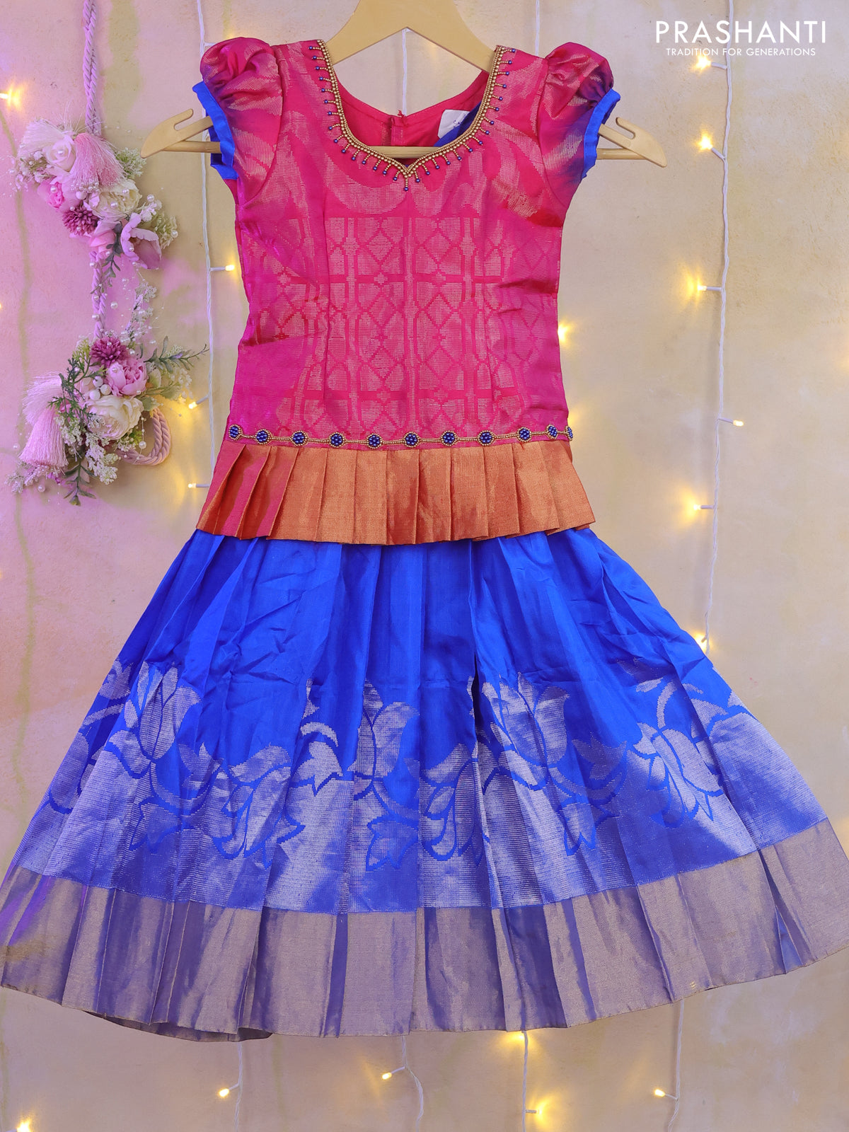 Silk kids lehenga pink and blue with silver zari woven brocade weaves & aari work neck and silver zari woven buttas & border for 3-4 years