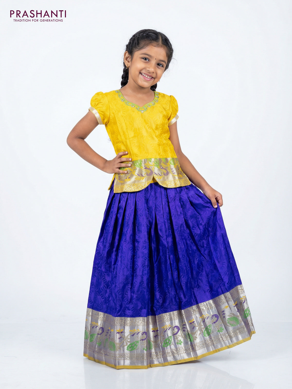 Silk kids lehenga yellow and blue with aari work neck pattern and long silver zari woven border for 7-8 years