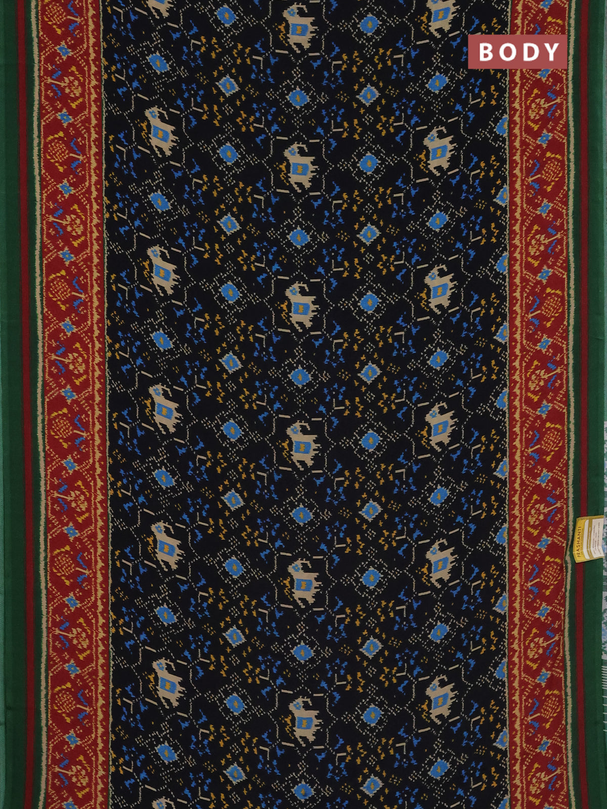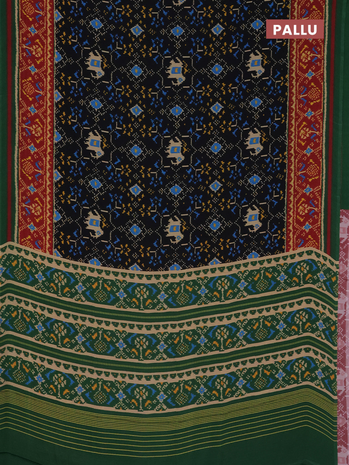 Semi crepe saree black and green with allover ikat prints and printed border