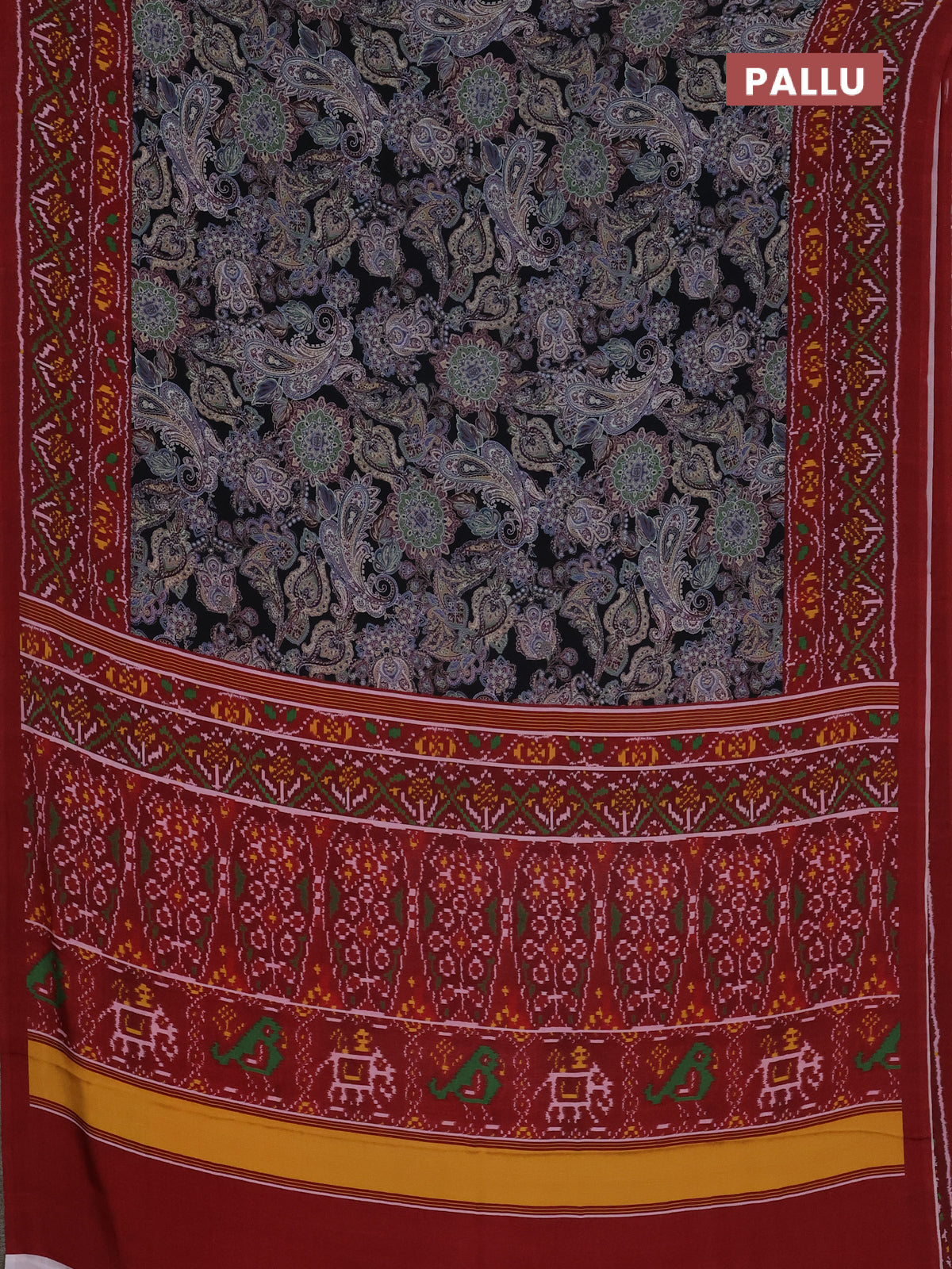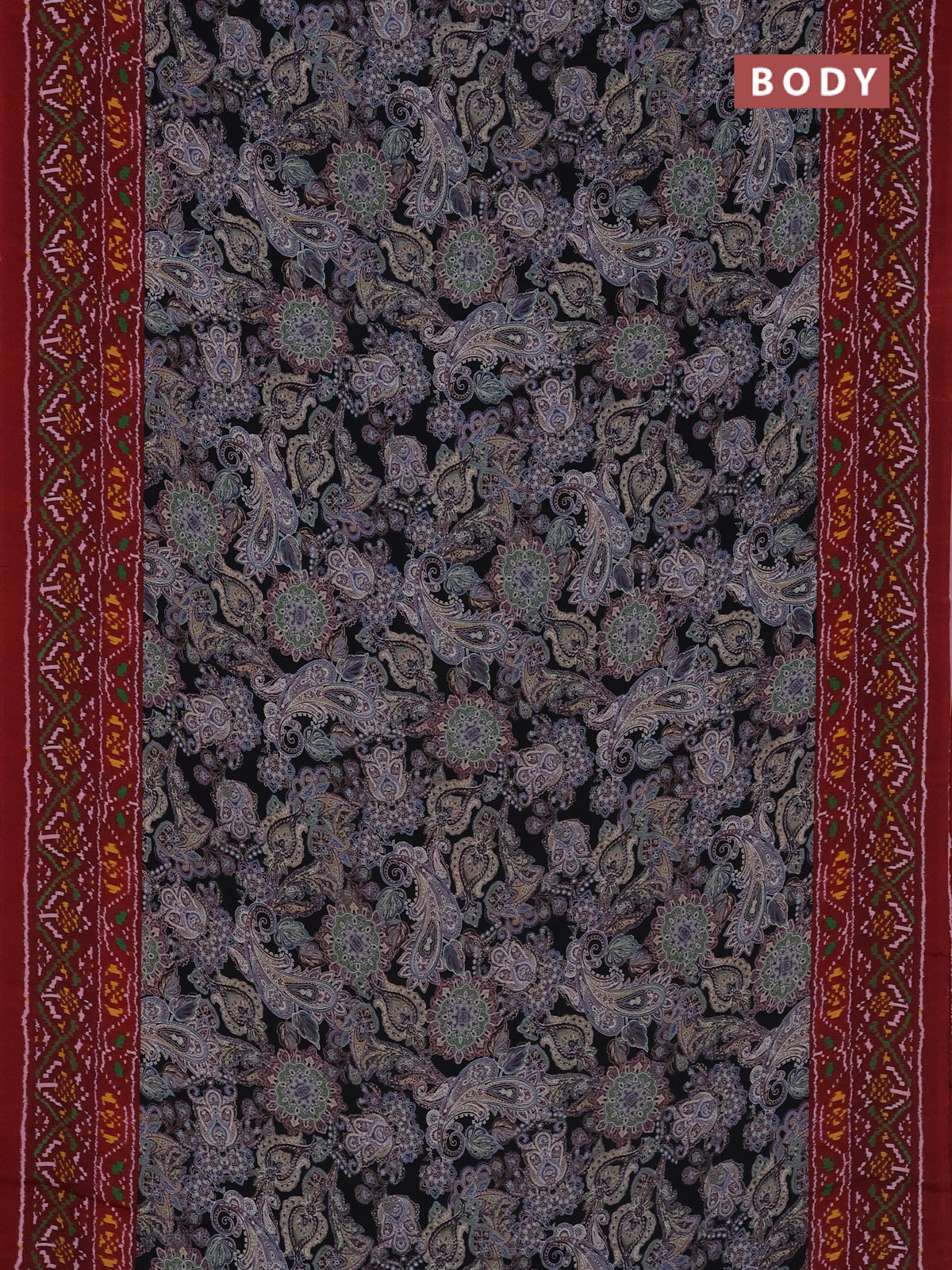 Semi crepe saree black and maroon with allover prints and printed border