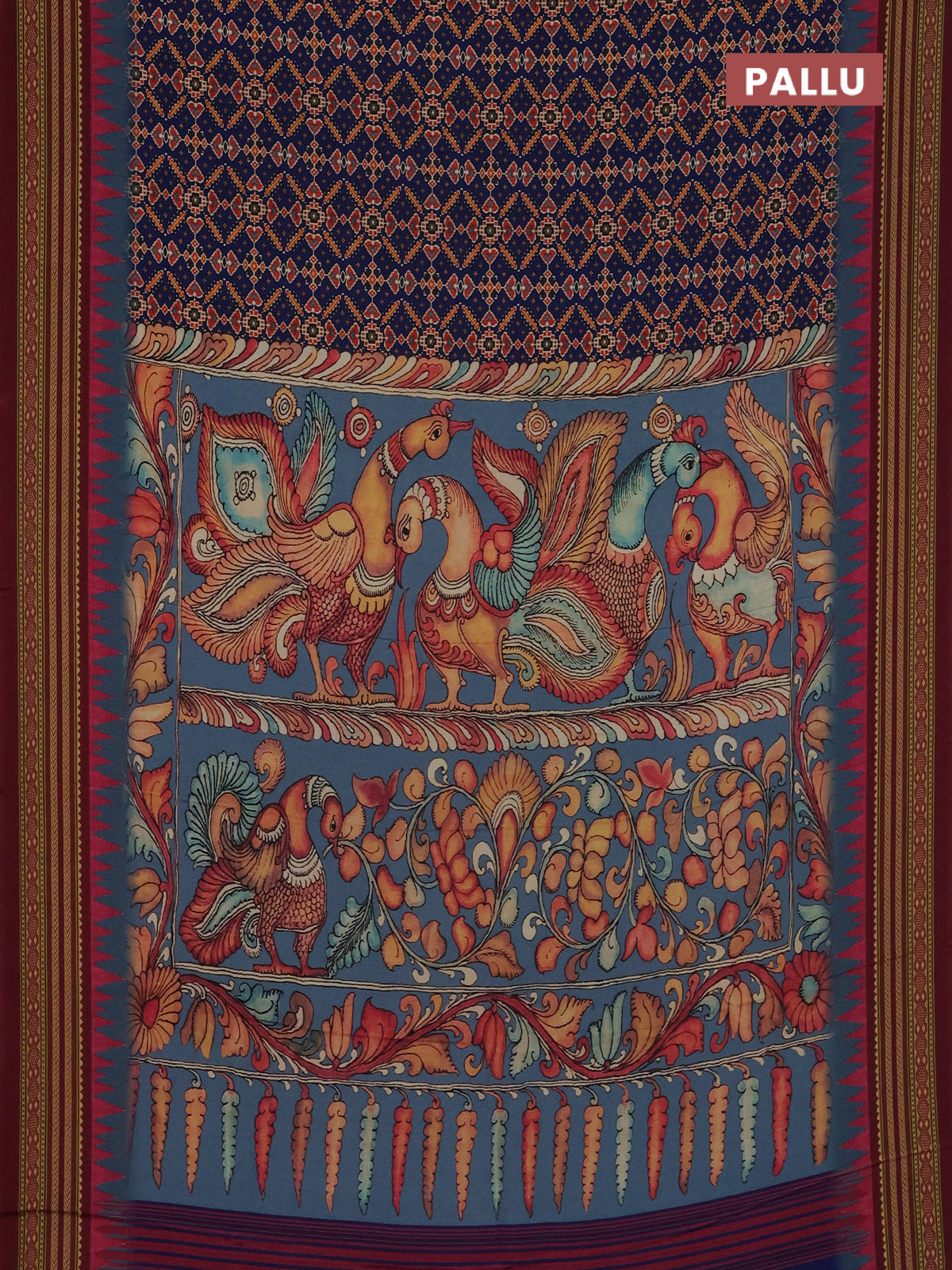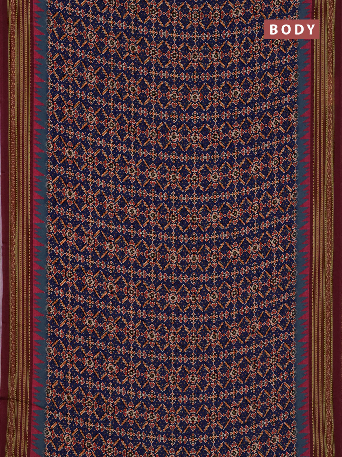 Semi crepe saree blue and maroon with allover ikat prints and printed border