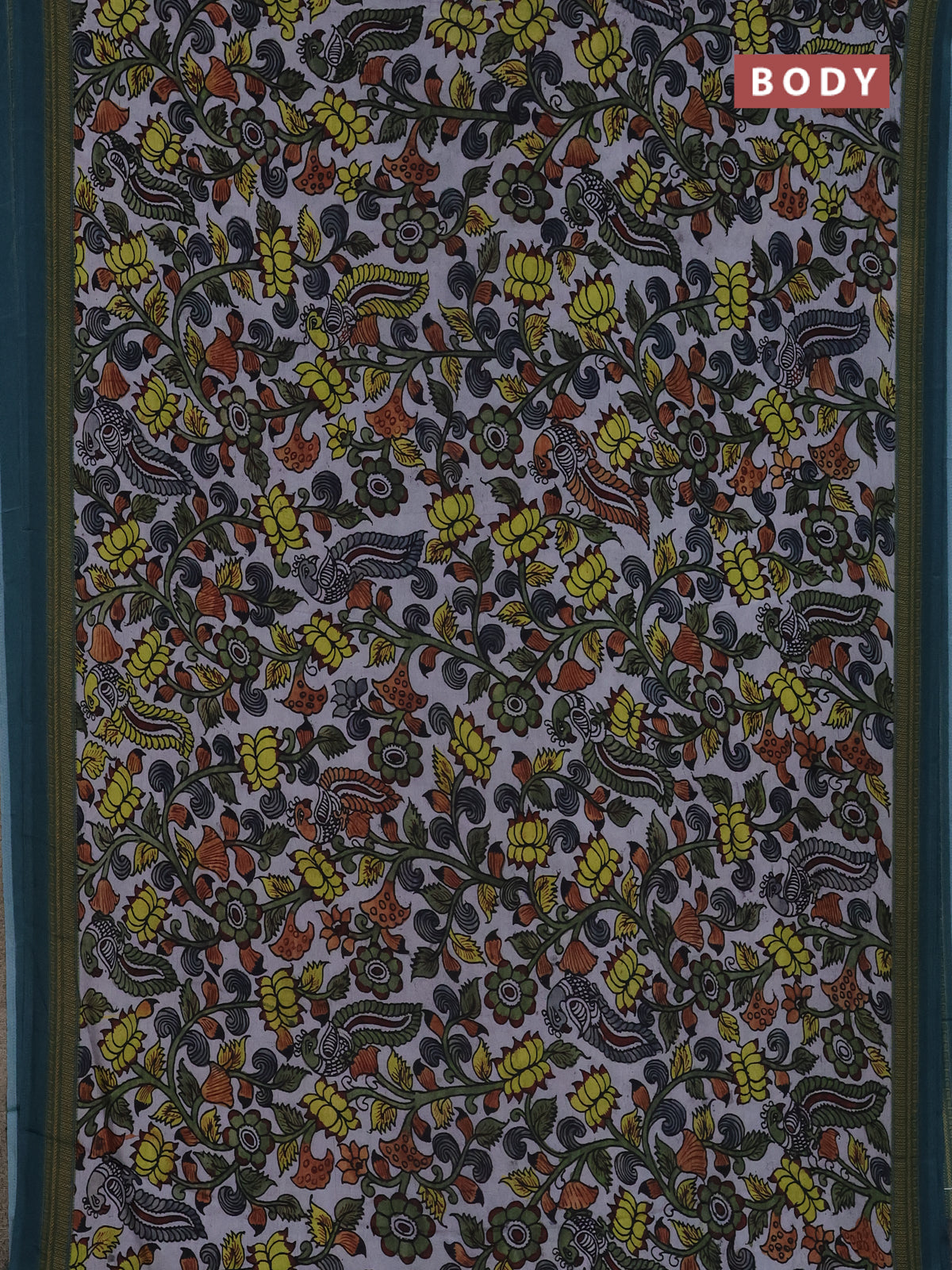 Semi crepe saree grey and peacock green with kalamkari prints and printed border