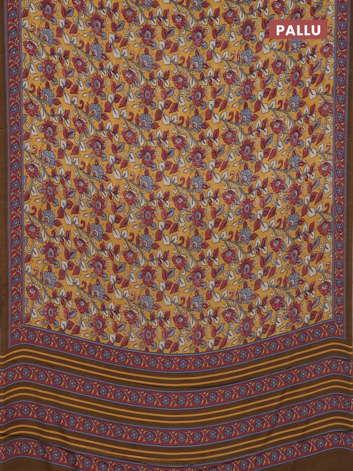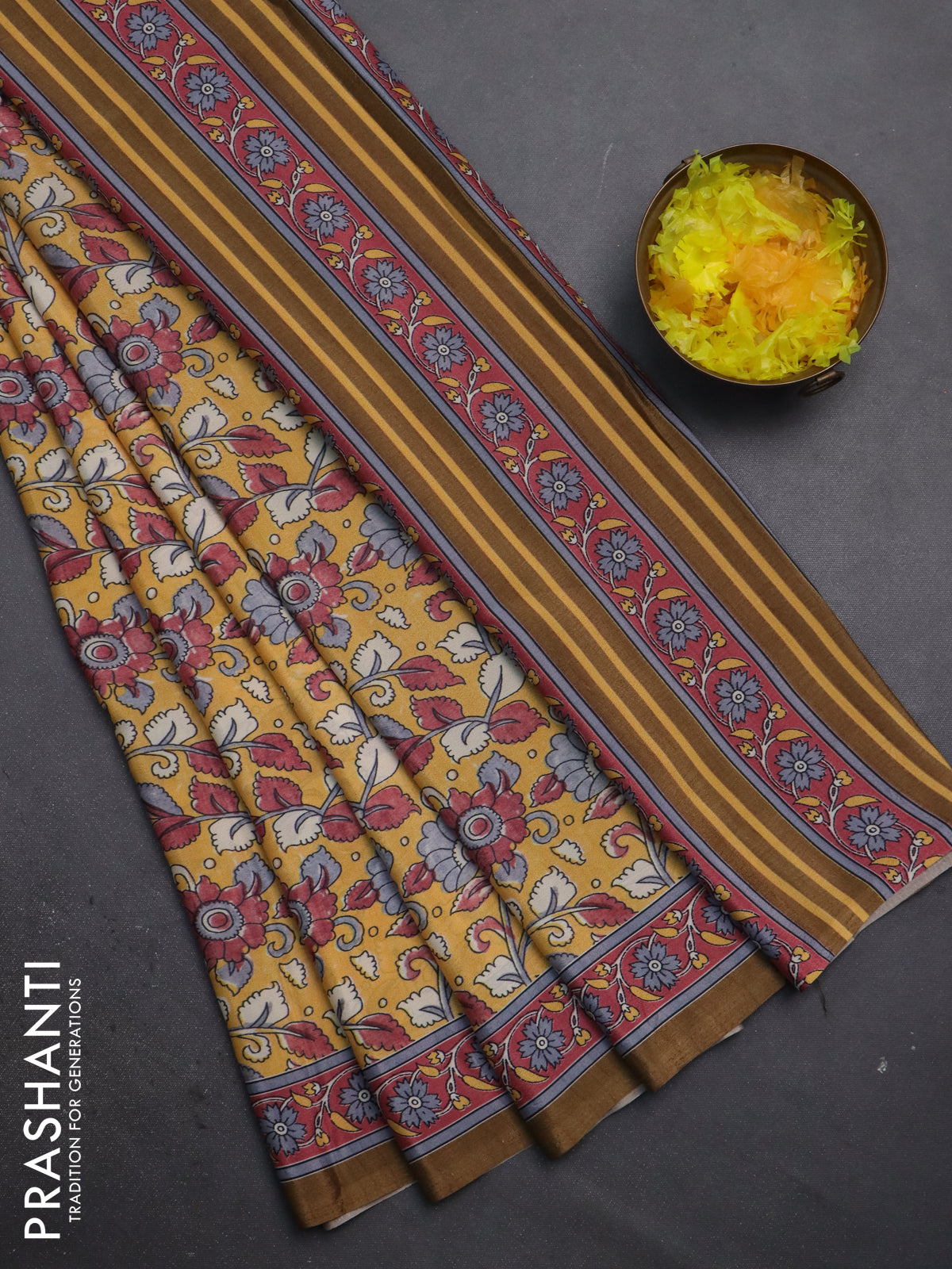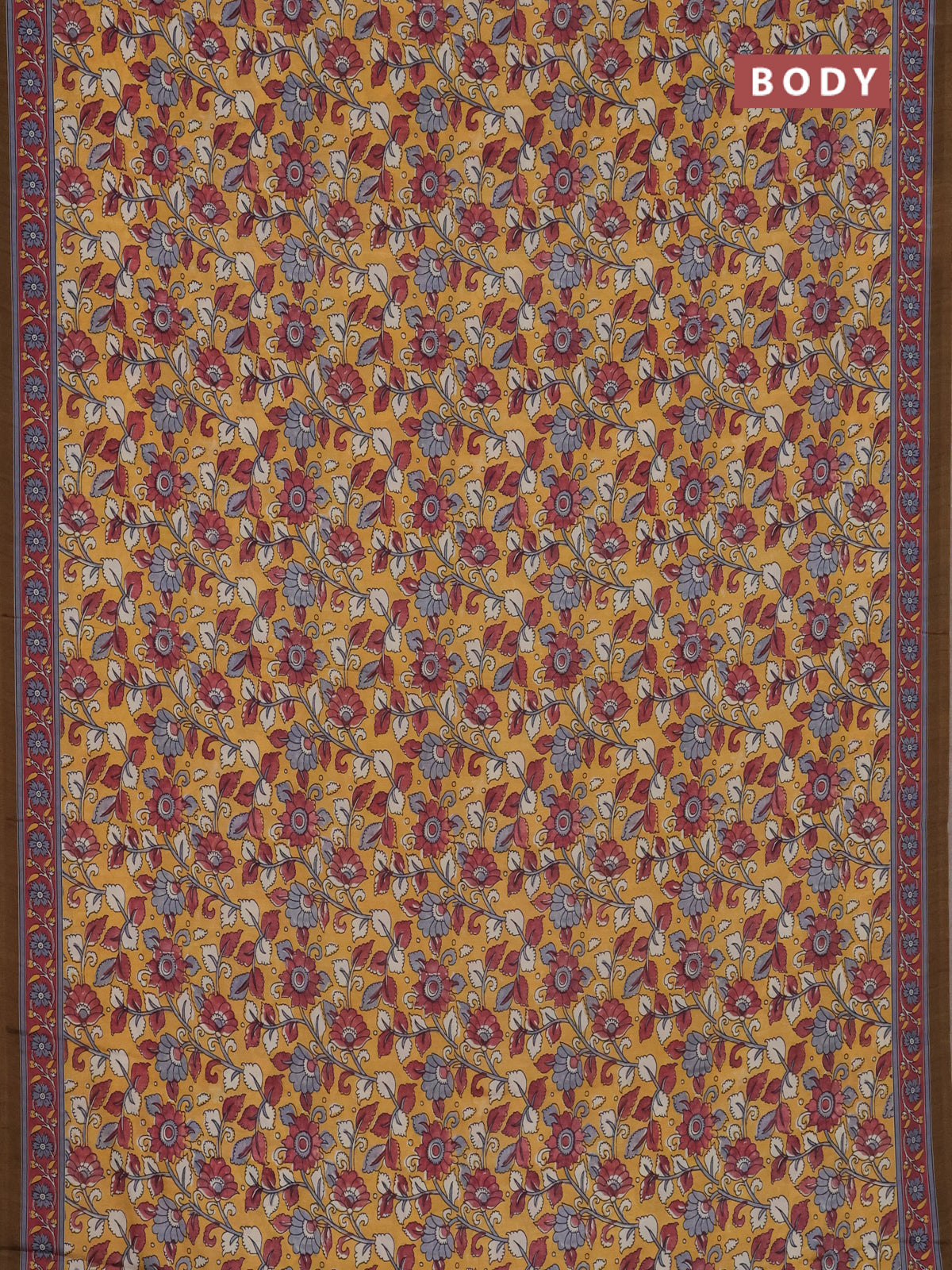 Semi crepe saree mustard yellow with allover kalamkari prints and printed border