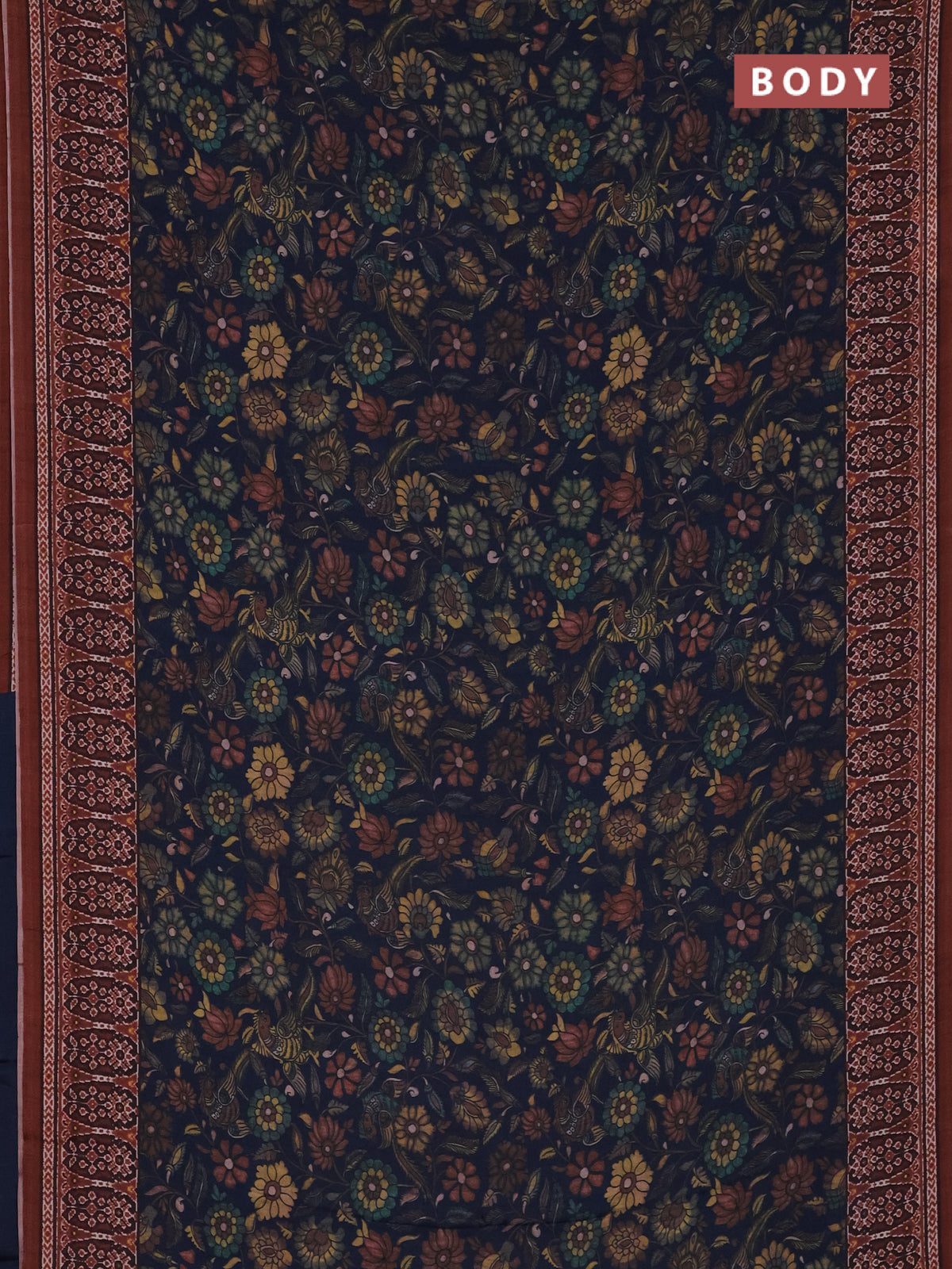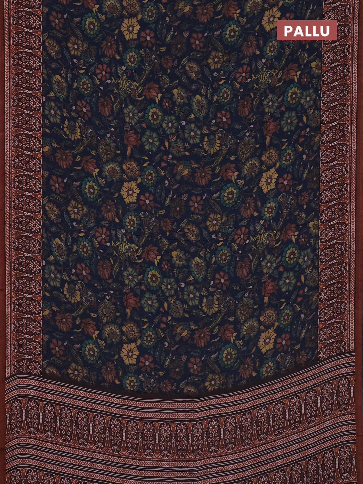 Semi crepe saree peacock blue and rust shade with allover kalamkari prints and printed border