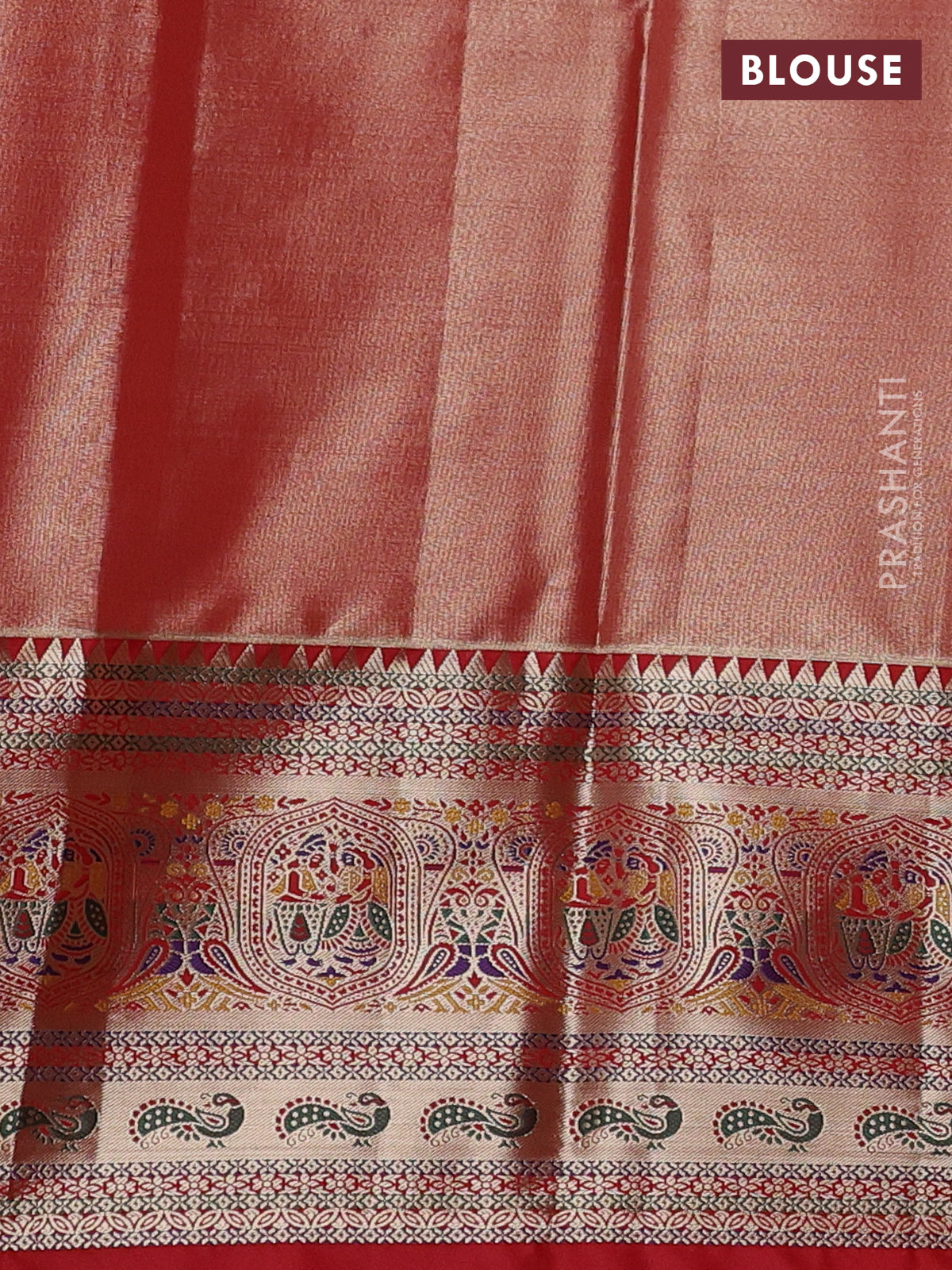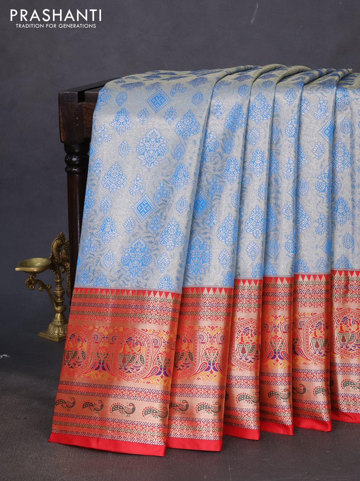 Tissue paithani silk saree blue and red with allover zari woven brocade weaves and long zari woven paithani style border