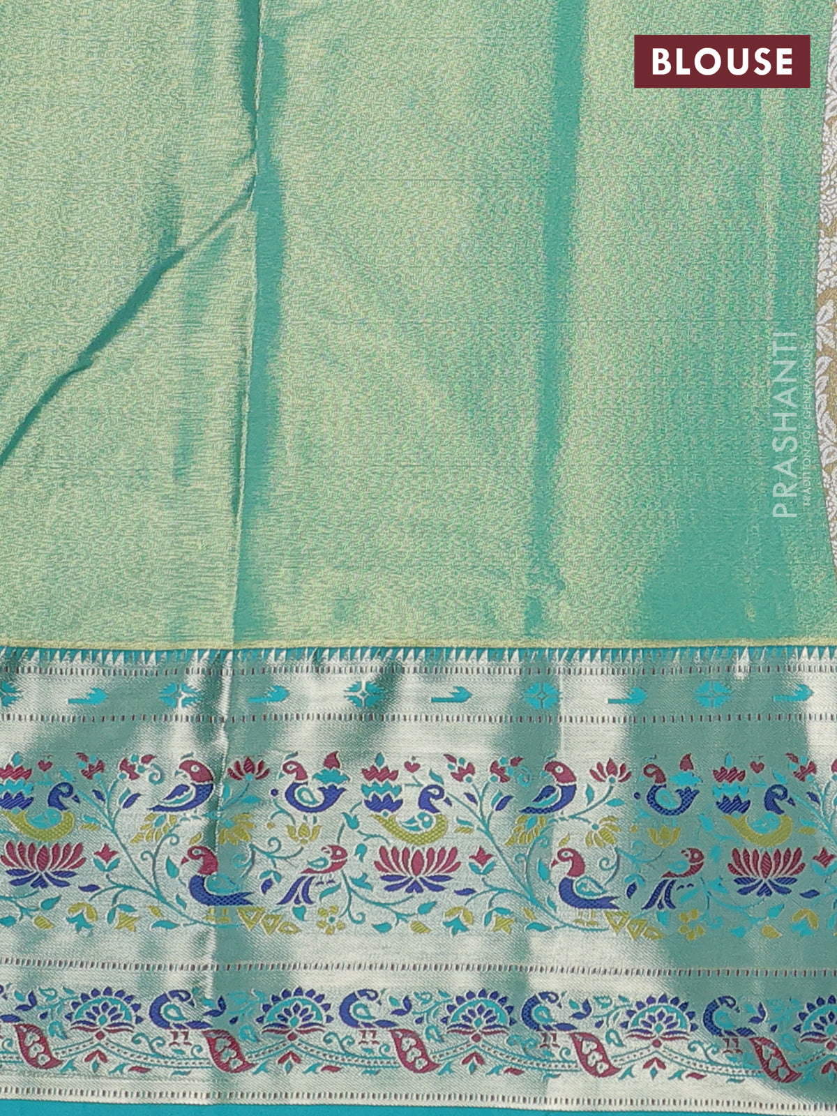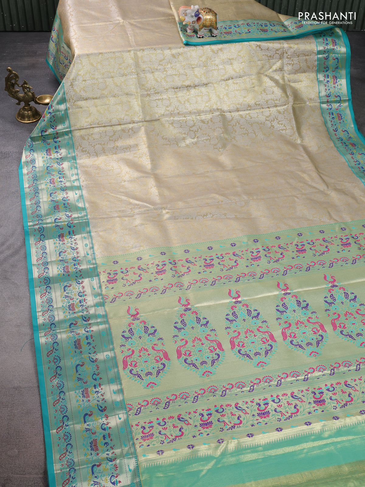 Tissue paithani silk saree cream and teal green with allover silver zari woven brocade weaves and zari woven paithani style border