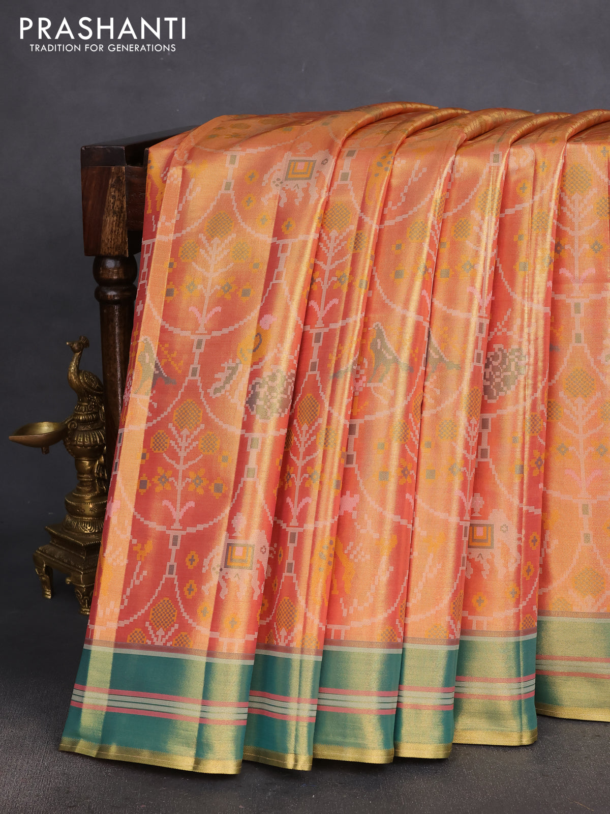 Tissue paithani silk saree dual shade of orange and teal green with allover patola weaves and zari woven border