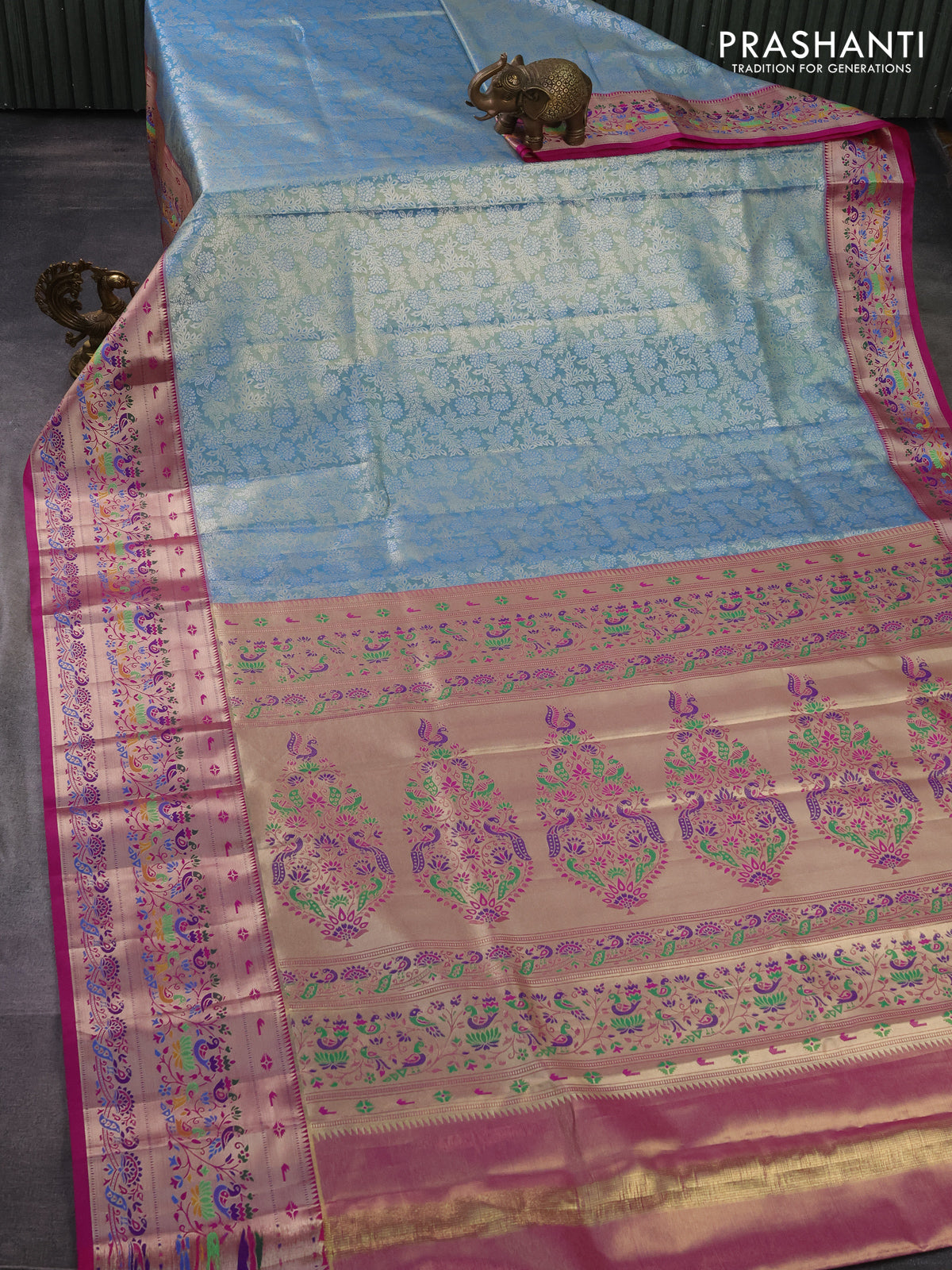 Tissue paithani silk saree light blue and pink with allover silver zari woven brocade weaves and long zari woven paithani style border