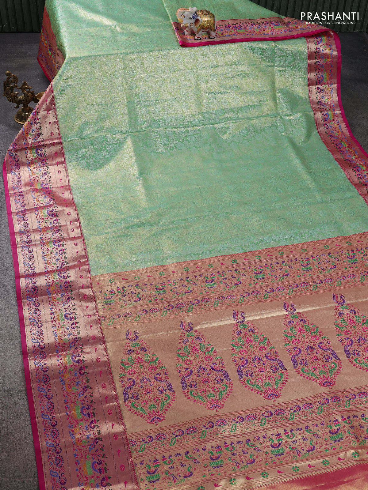Tissue paithani silk saree light green and pink with allover silver zari woven brocade weaves and zari woven paithani style border