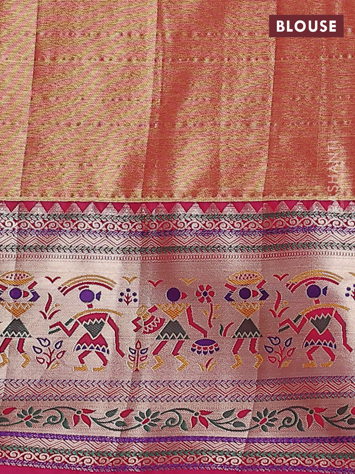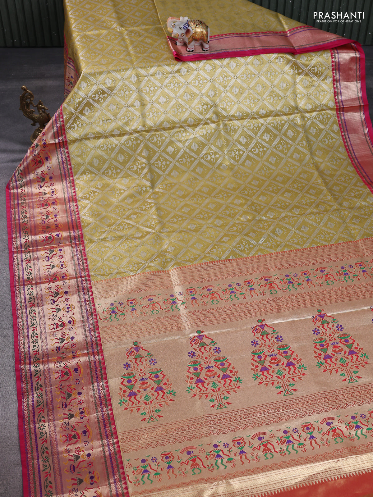Tissue paithani silk saree mustard yellow and pink with allover silver zari woven brocade weaves and long zari woven paithani style border