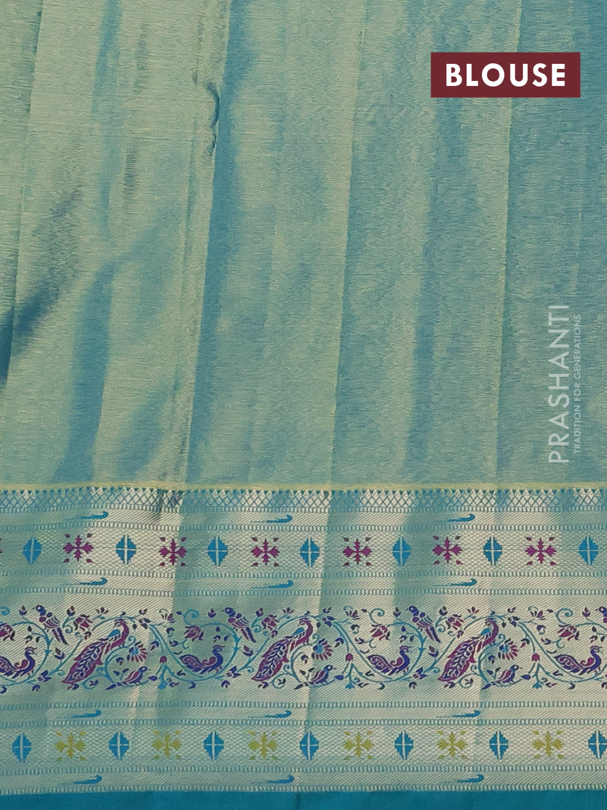 Tissue paithani silk saree mustard yellow and teal green with allover silver zari woven brocade weaves and zari woven paithani style border