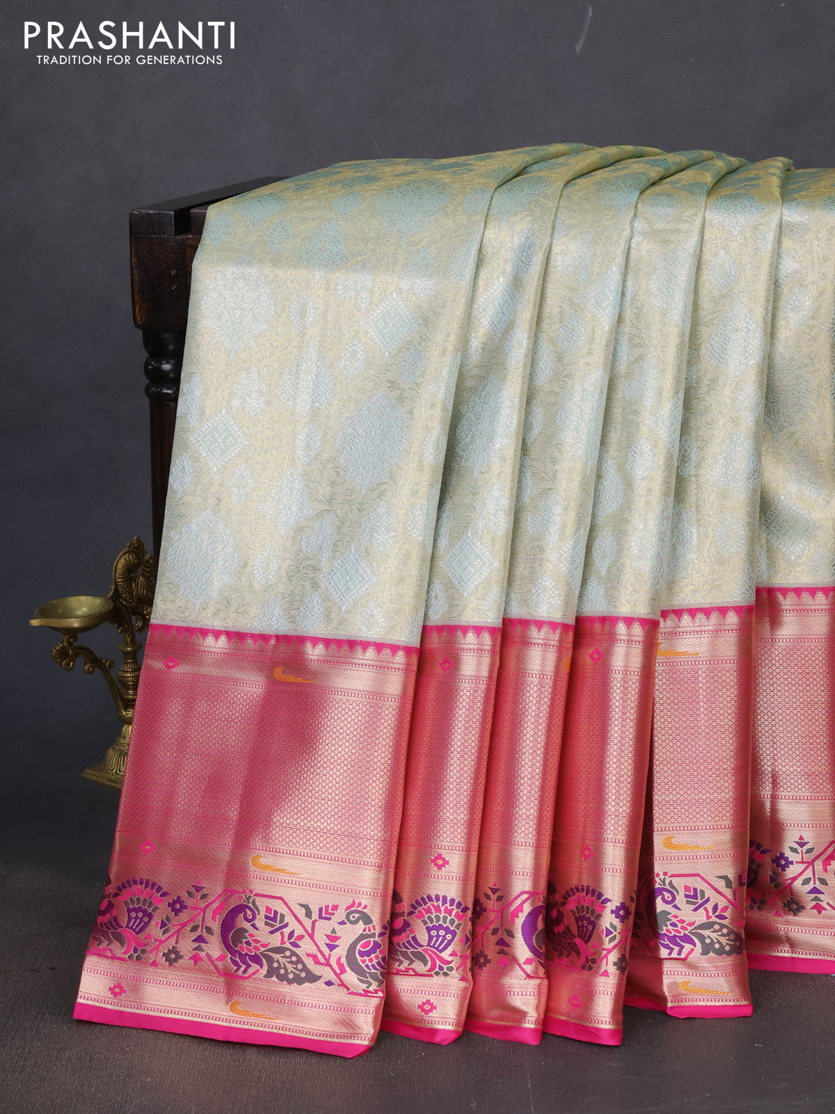 Tissue paithani silk saree pastel shade and pink with allover zari woven brocade weaves and long zari woven paithani style border