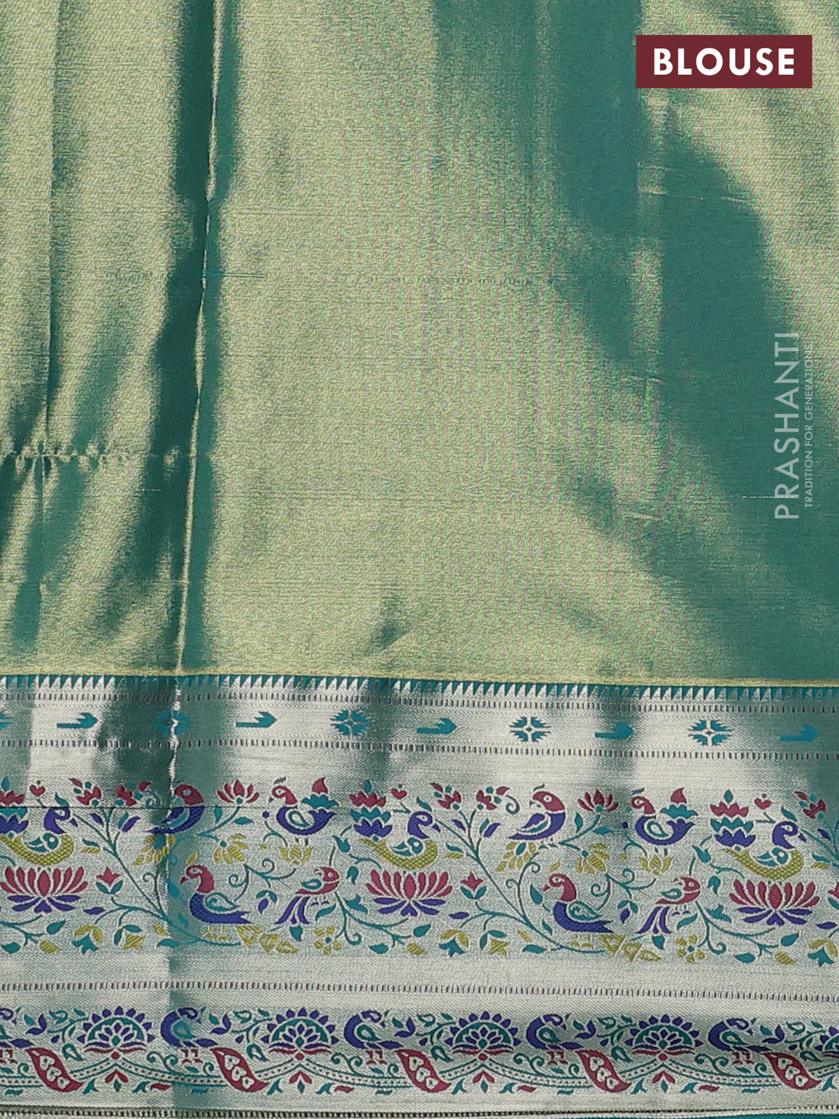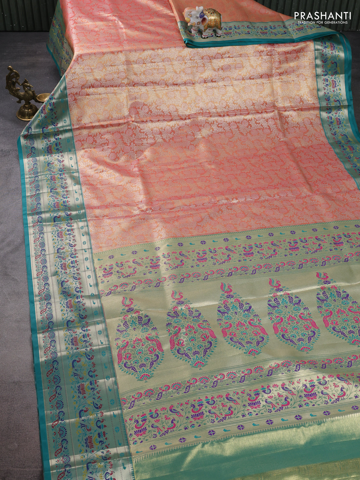 Tissue paithani silk saree peach shade and teal green with allover silver zari woven brocade weaves and zari woven paithani style border