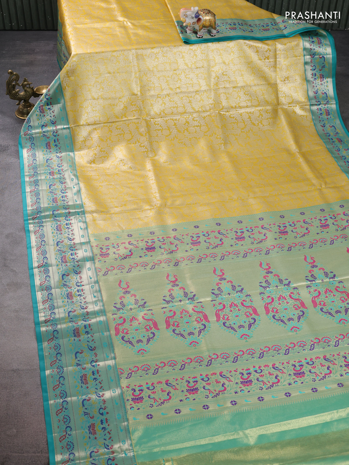 Tissue paithani silk saree yellow and teal blue with allover silver zari woven brocade weaves and zari woven paithani style border