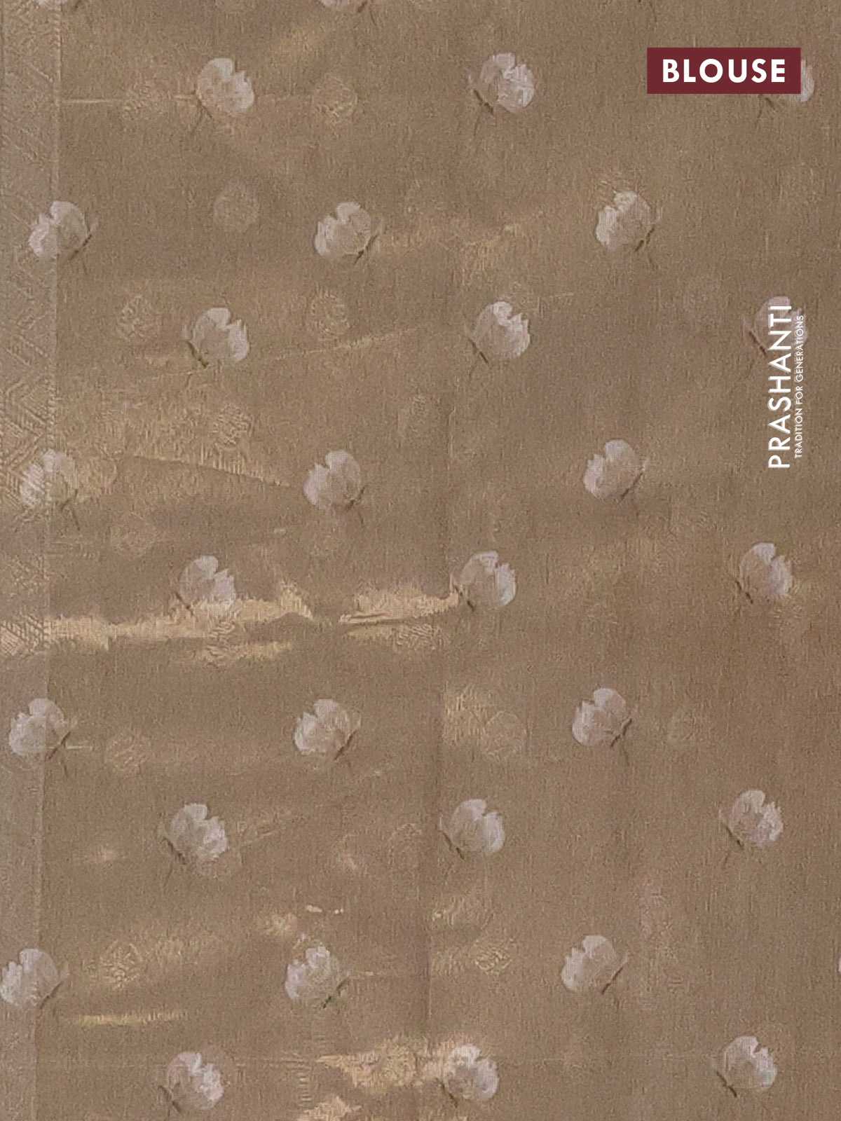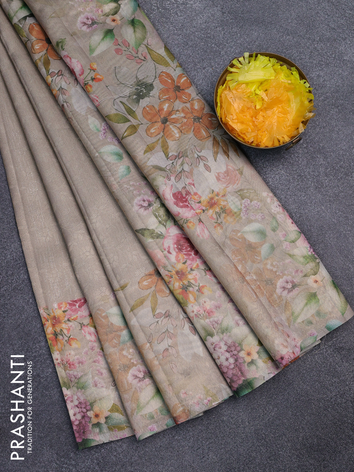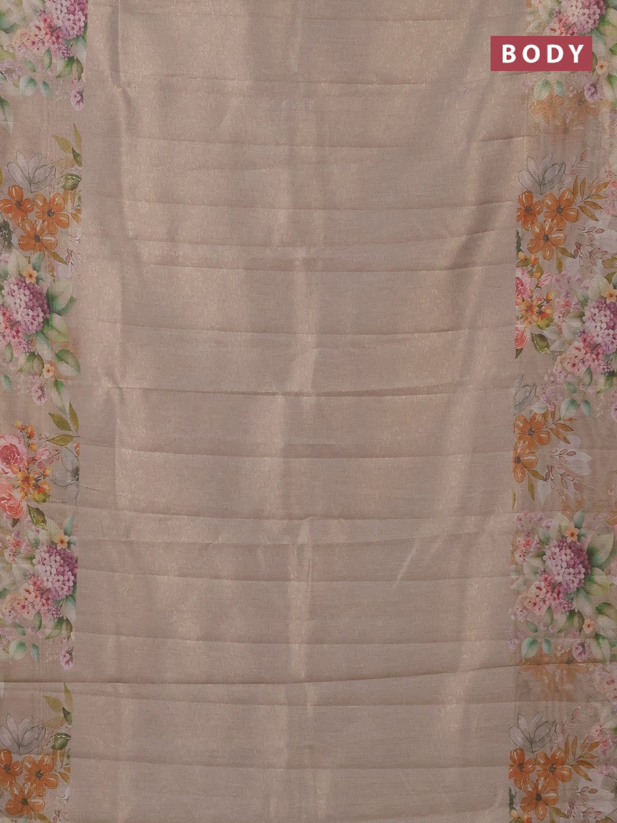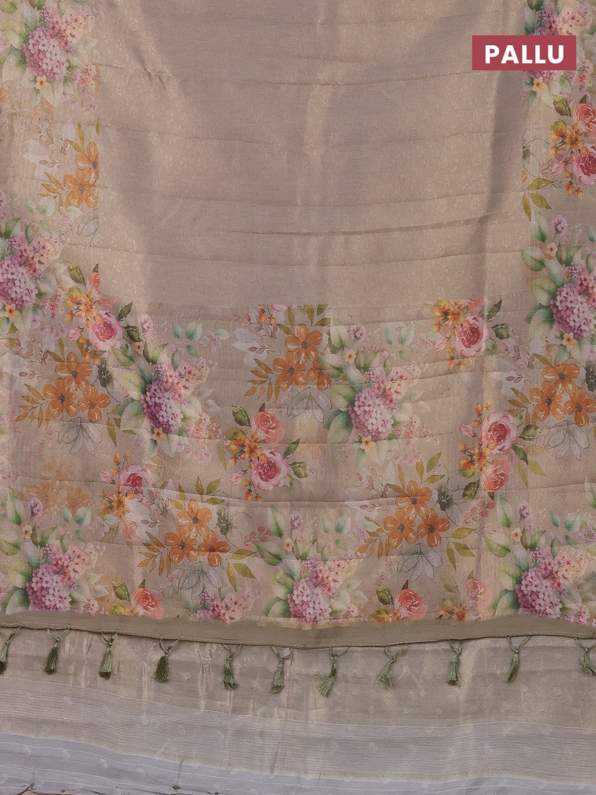 Tissue saree beige and green shade with allover zari weaves and floral digital printed border