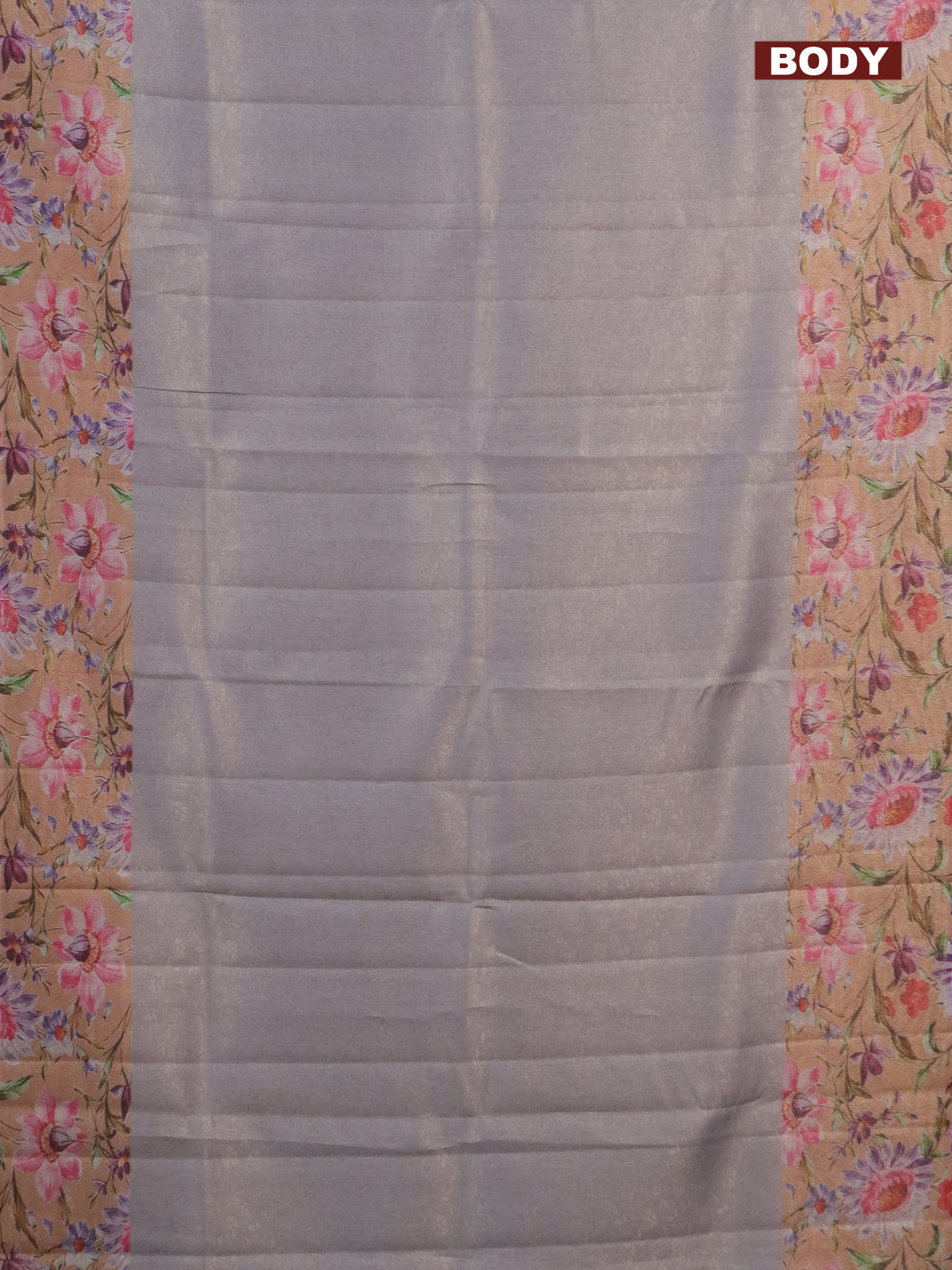 Tissue saree grey and peach orange with allover zari weaves and floral digital printed border