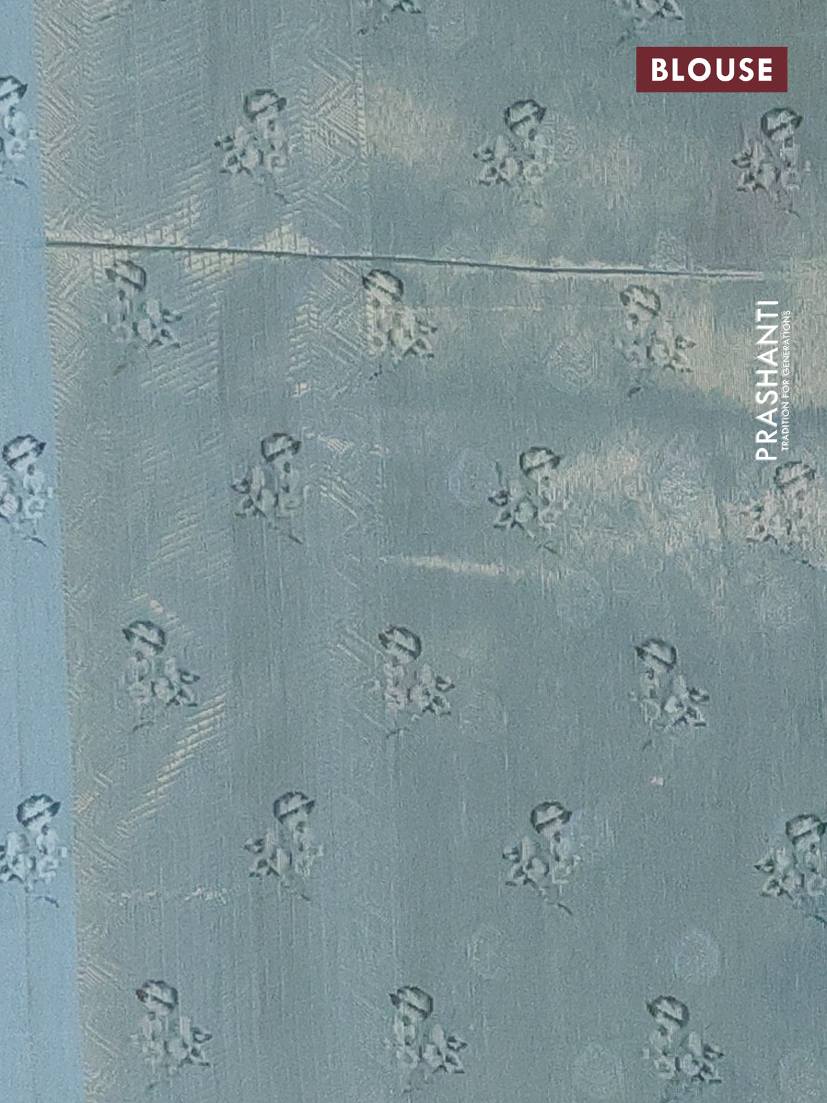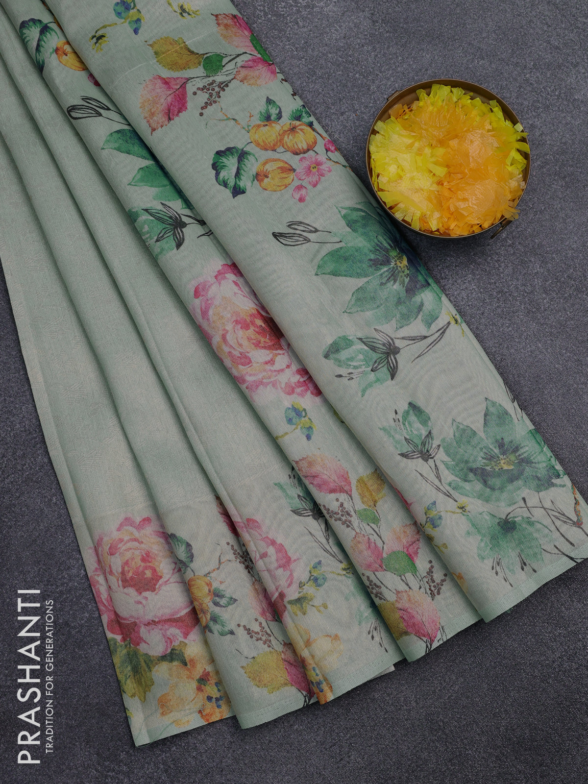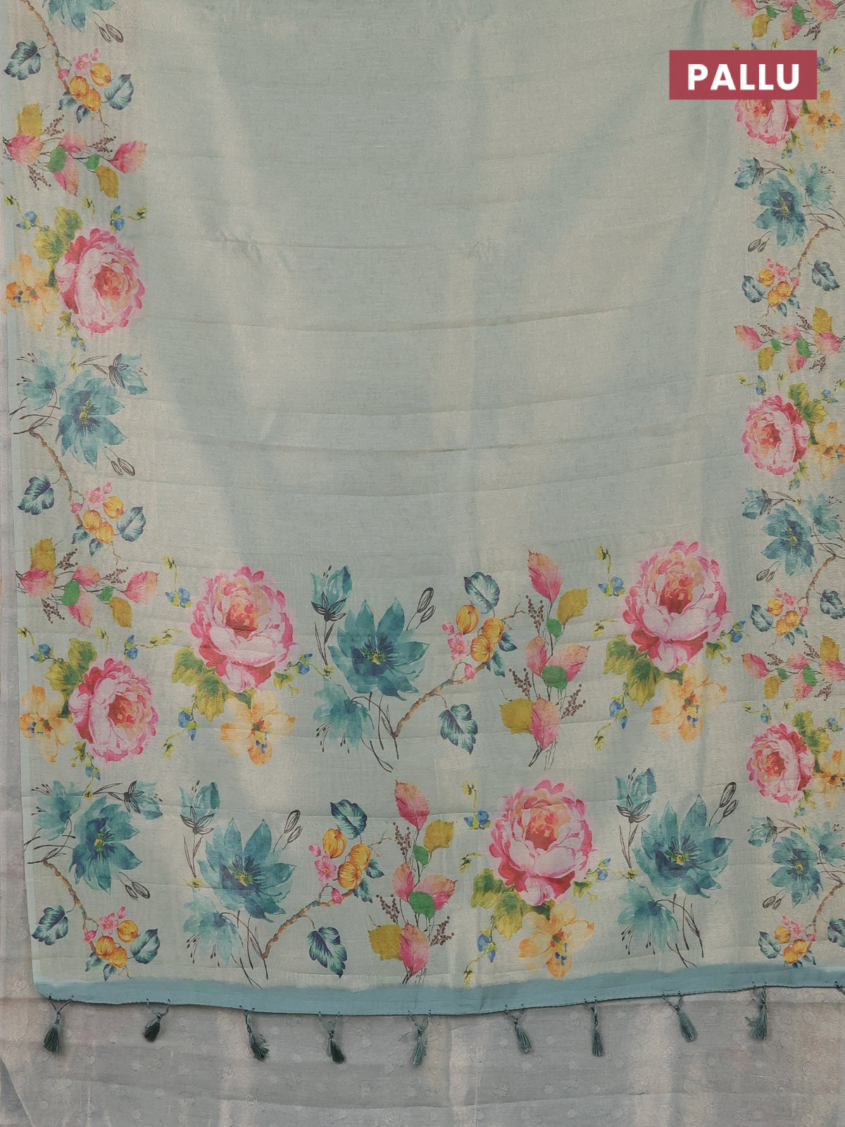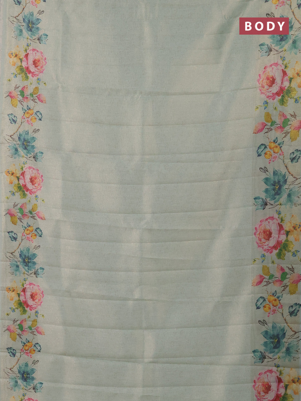 Tissue saree pastel green with allover zari weaves and digital printed border