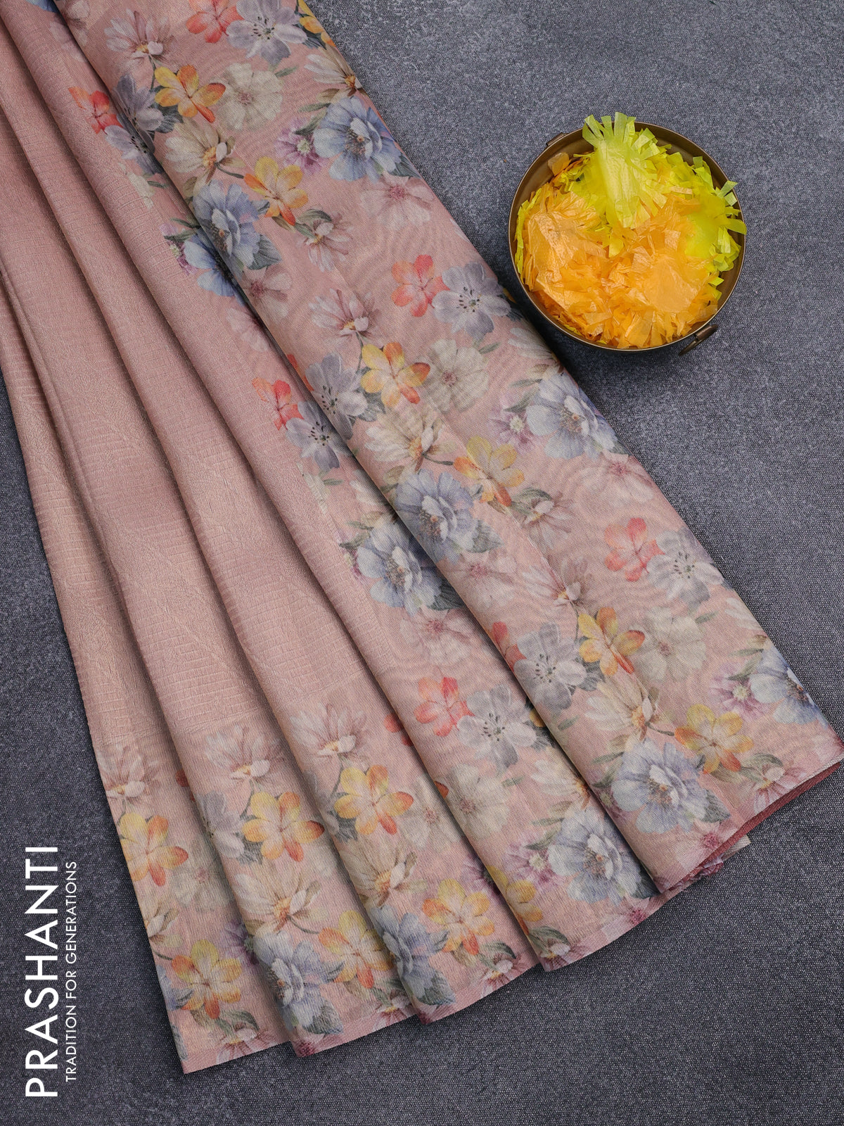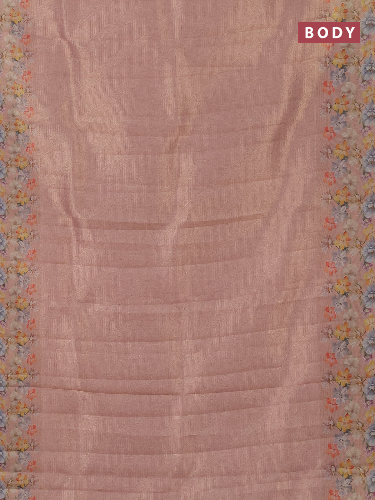 Tissue saree peach orange with allover zari weaves and floral digital printed border