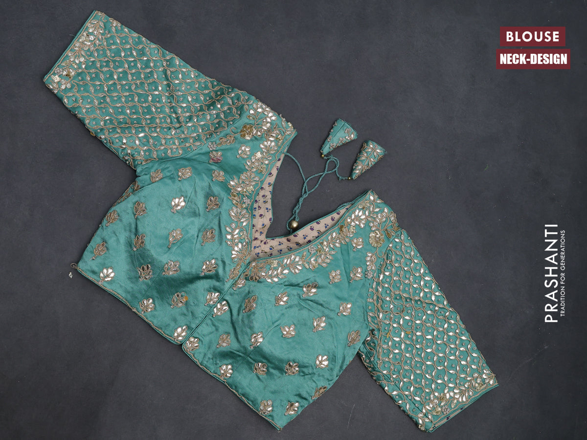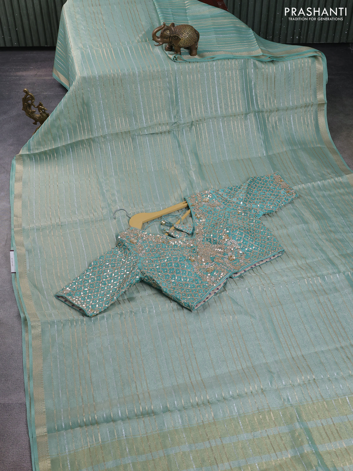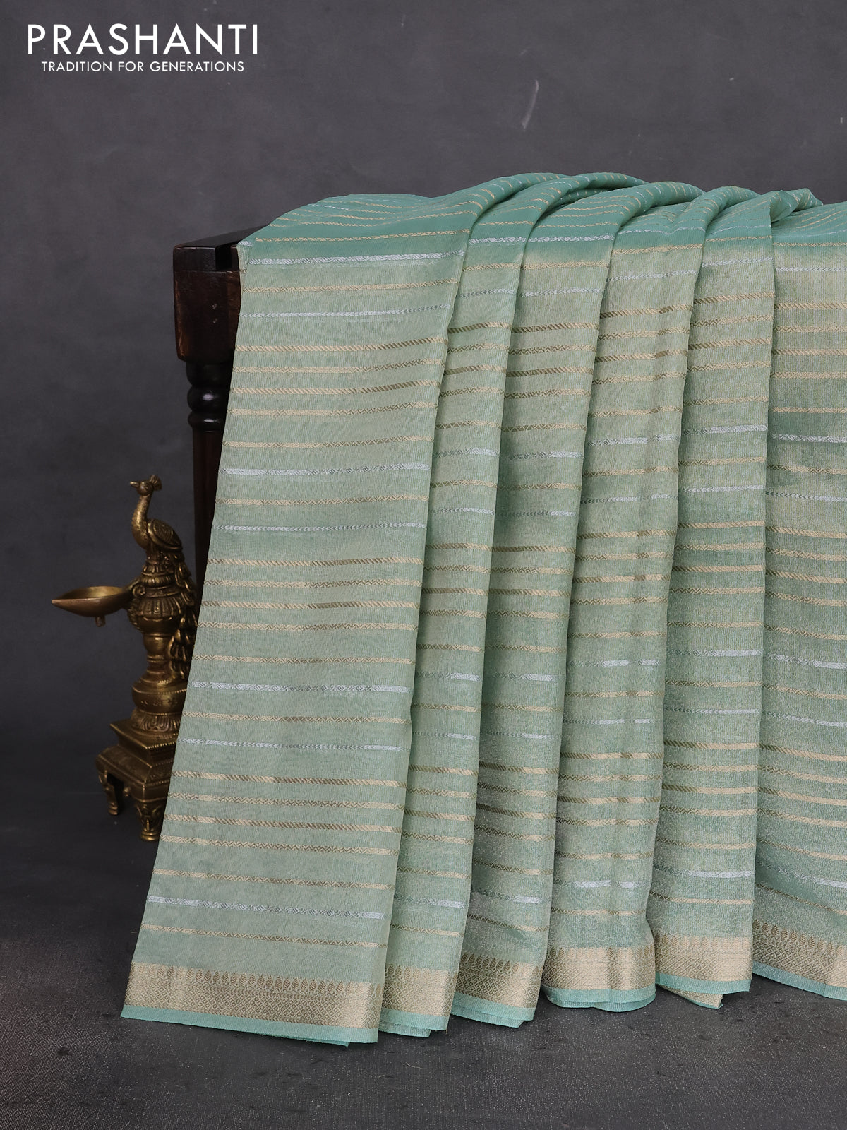 Tissue silk saree pastel green shade with allover silver & gold zari weaves and zari woven border