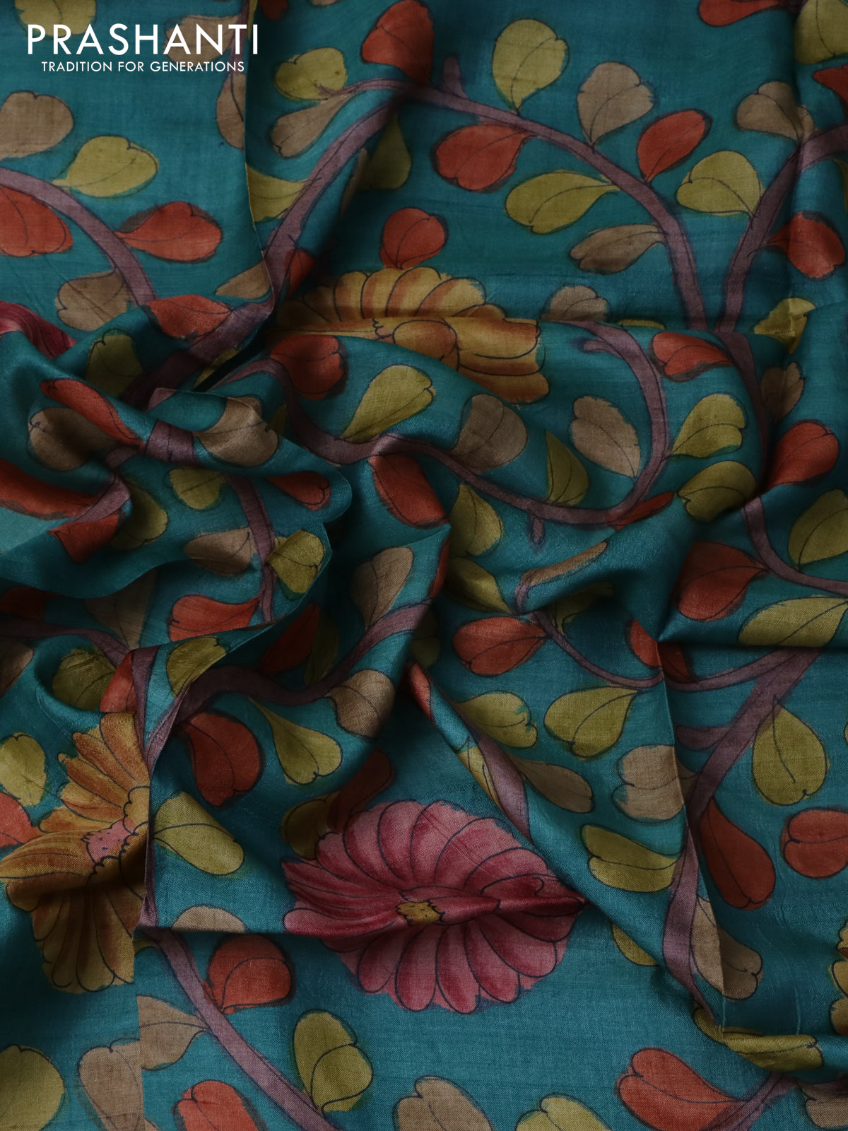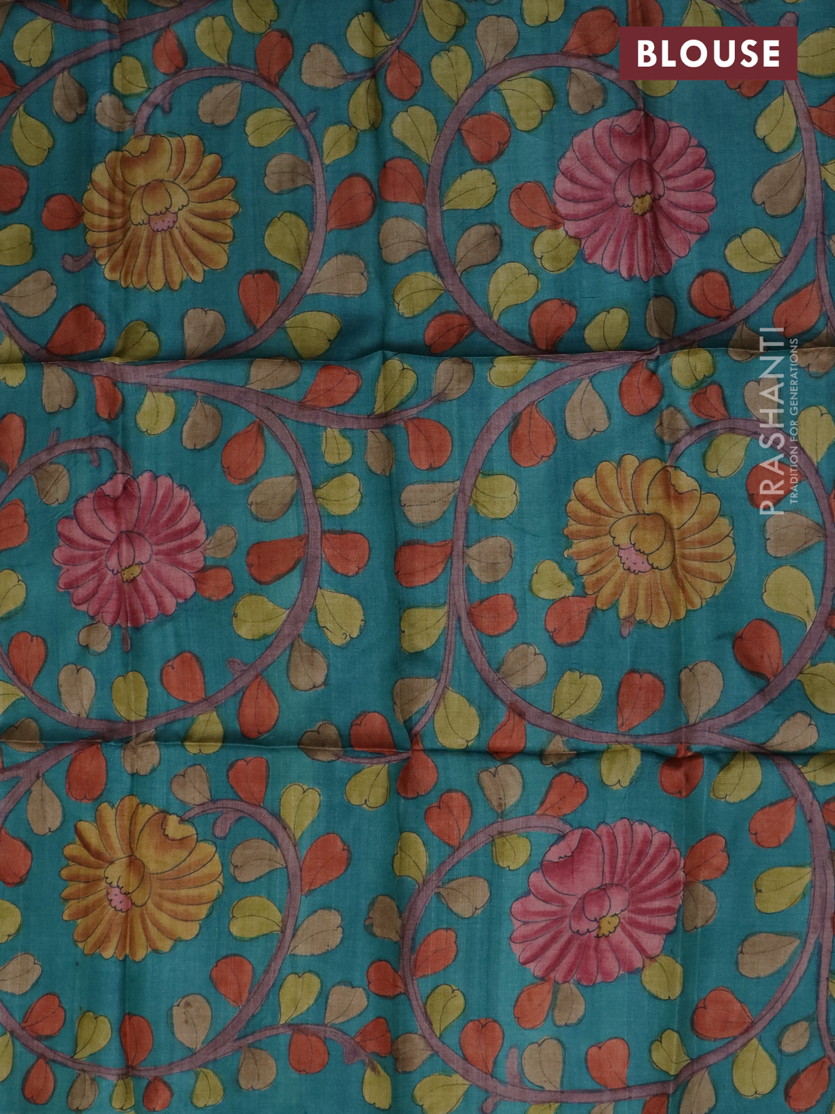 Tussar blouse piece teal blue with kalamkari hand painted prints
