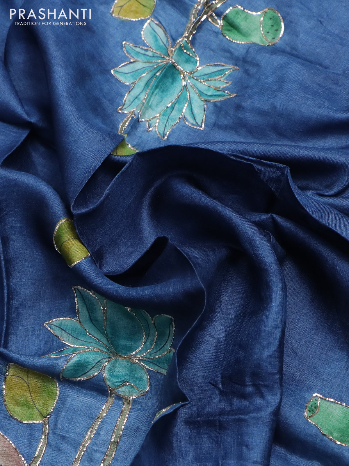 Tussar hand painted blouse piece blue with allover kalamkari prints & pita work