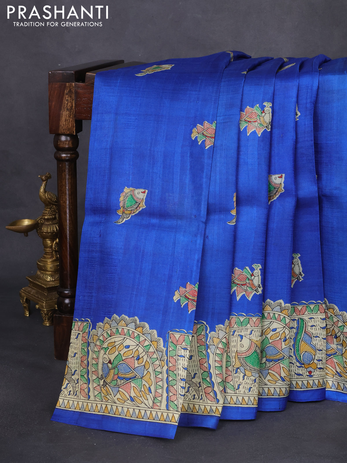 Madhubani printed silk saree blue and cream with butta prints and printed border