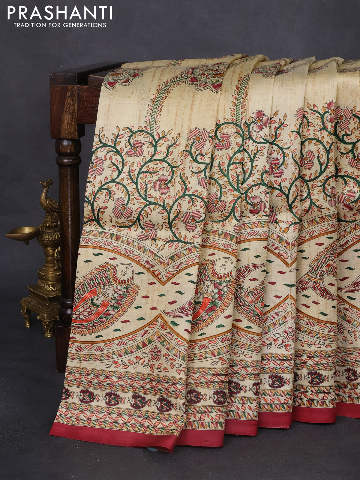 Madhubani printed silk saree cream and maroon with allover prints and printed border