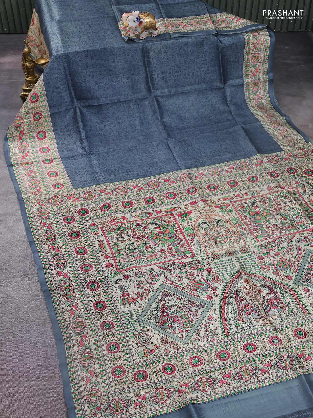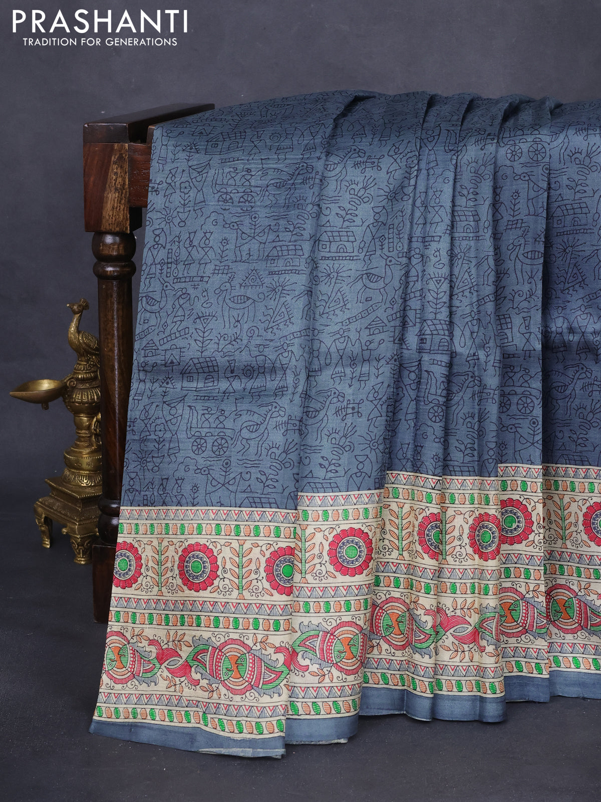 Madhubani printed silk saree grey and cream with allover prints and printed border