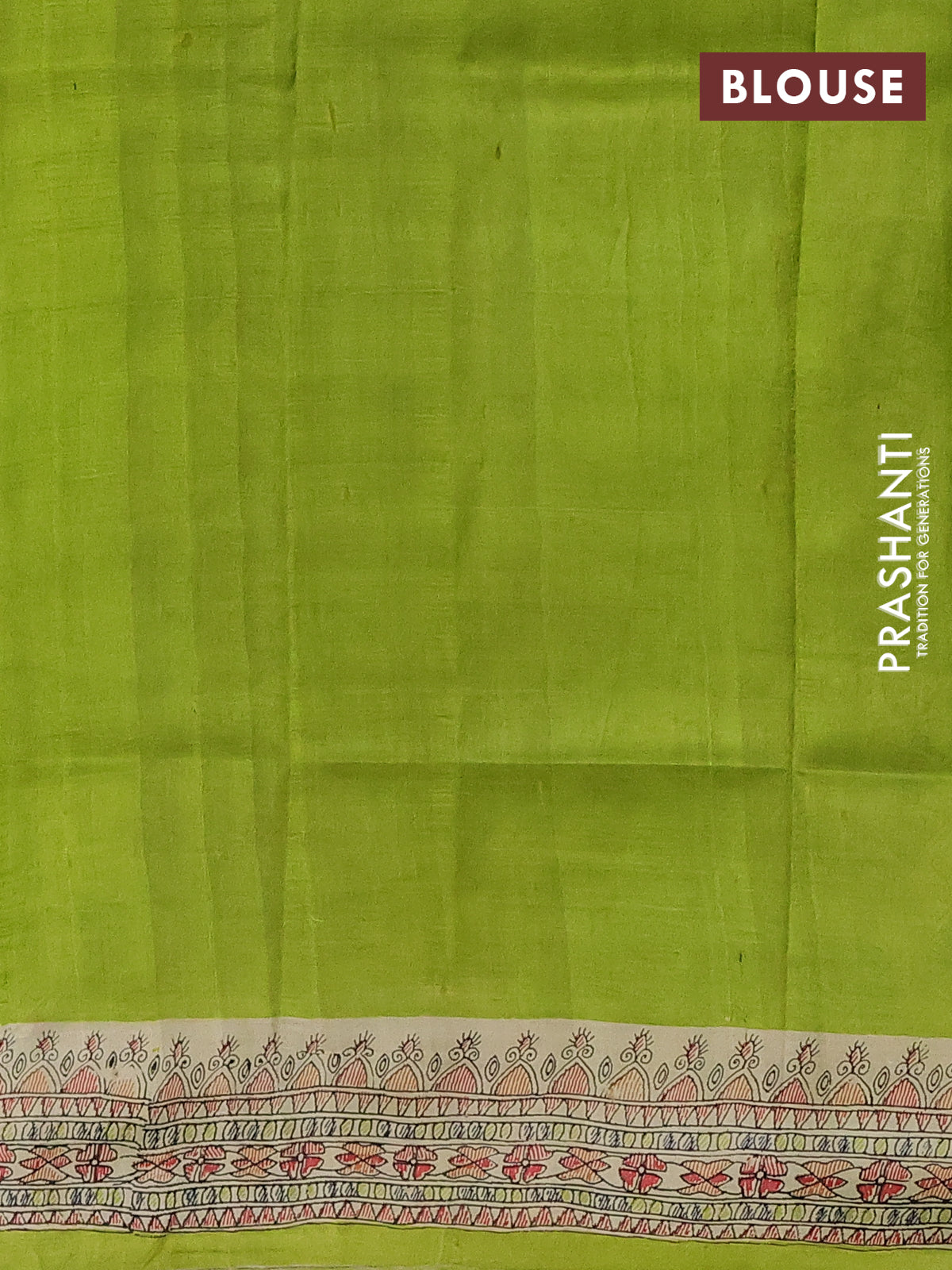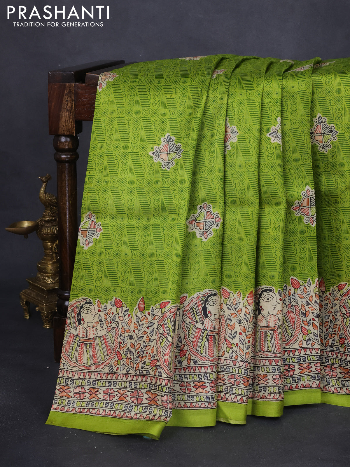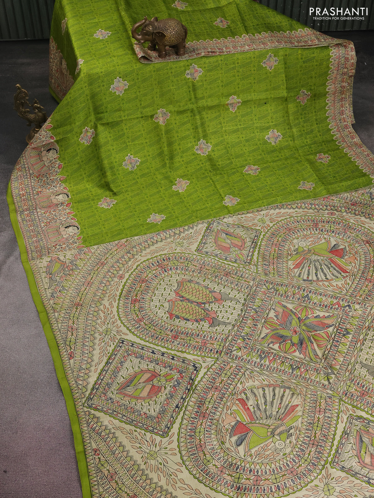 Madhubani printed silk saree light green and cream with allover prints and printed border