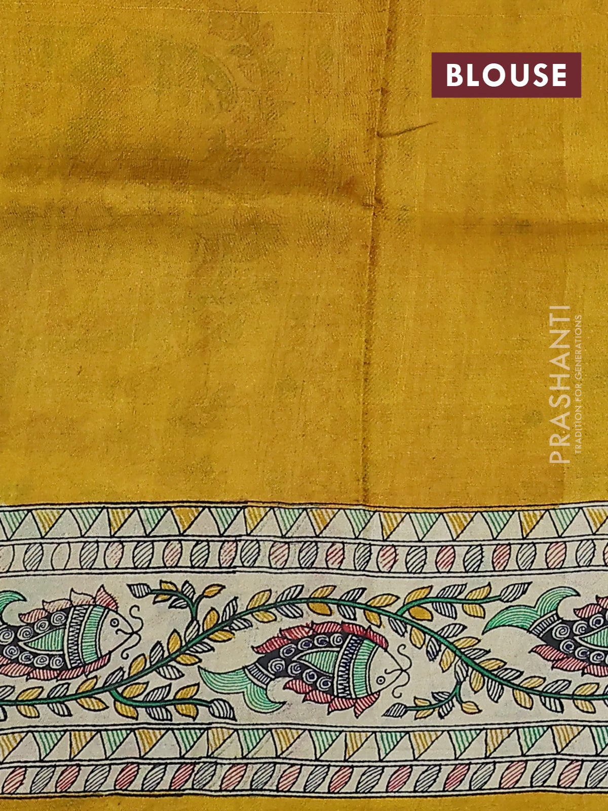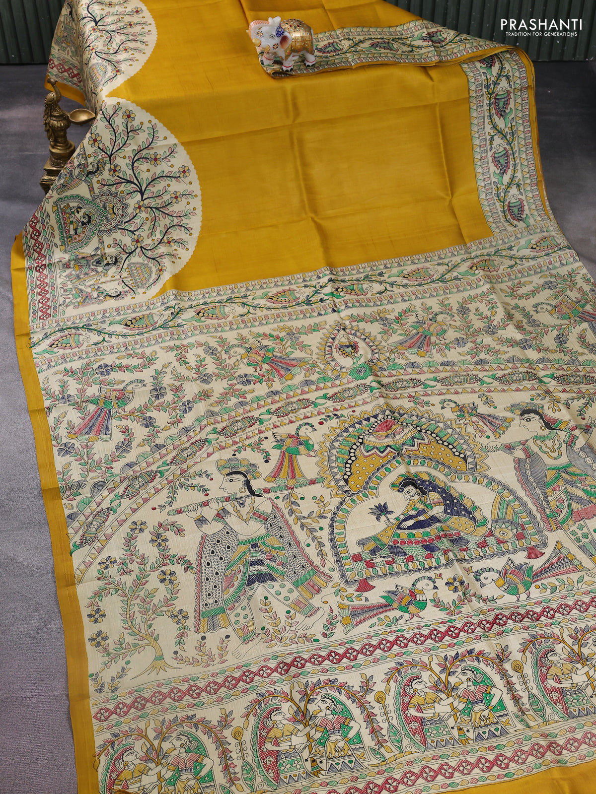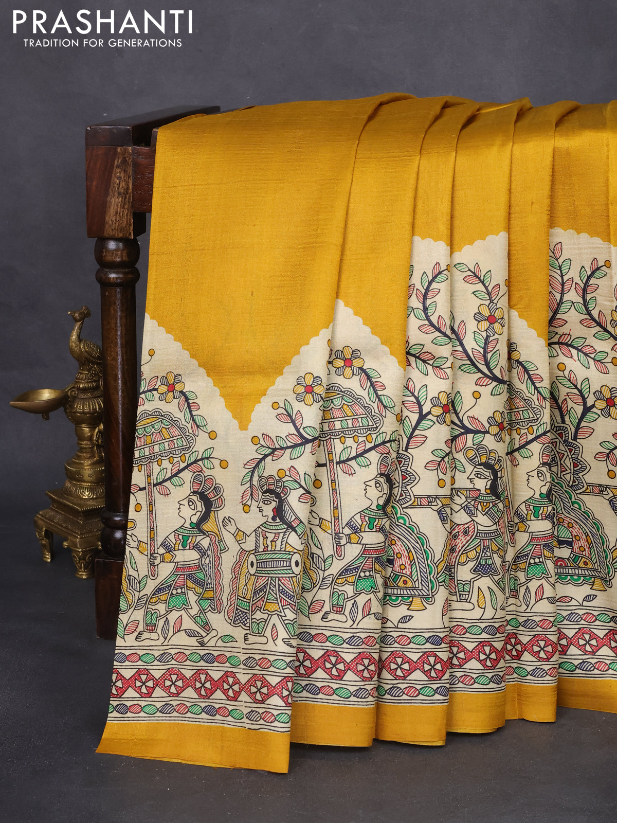 Madhubani printed silk saree mustard yellow and cream with plain body and long printed border