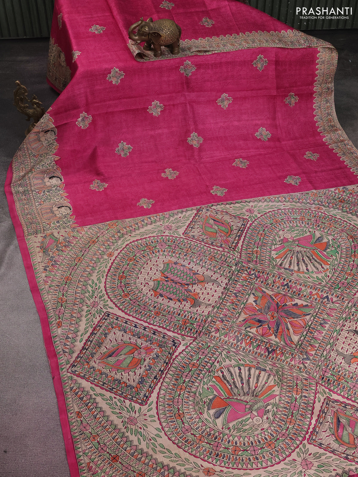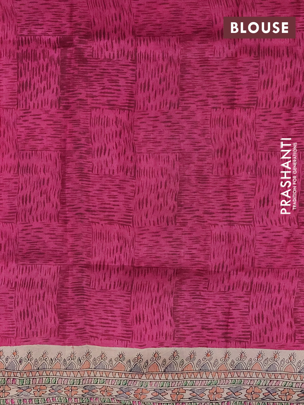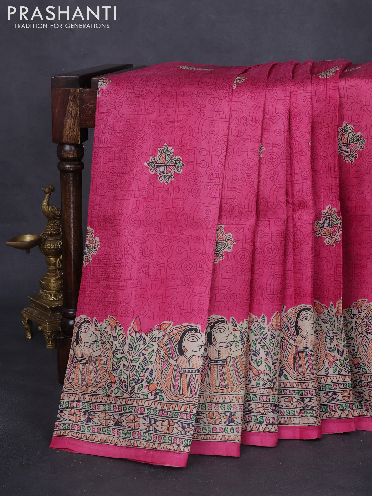 Madhubani printed silk saree pink and cream with allover prints and printed border