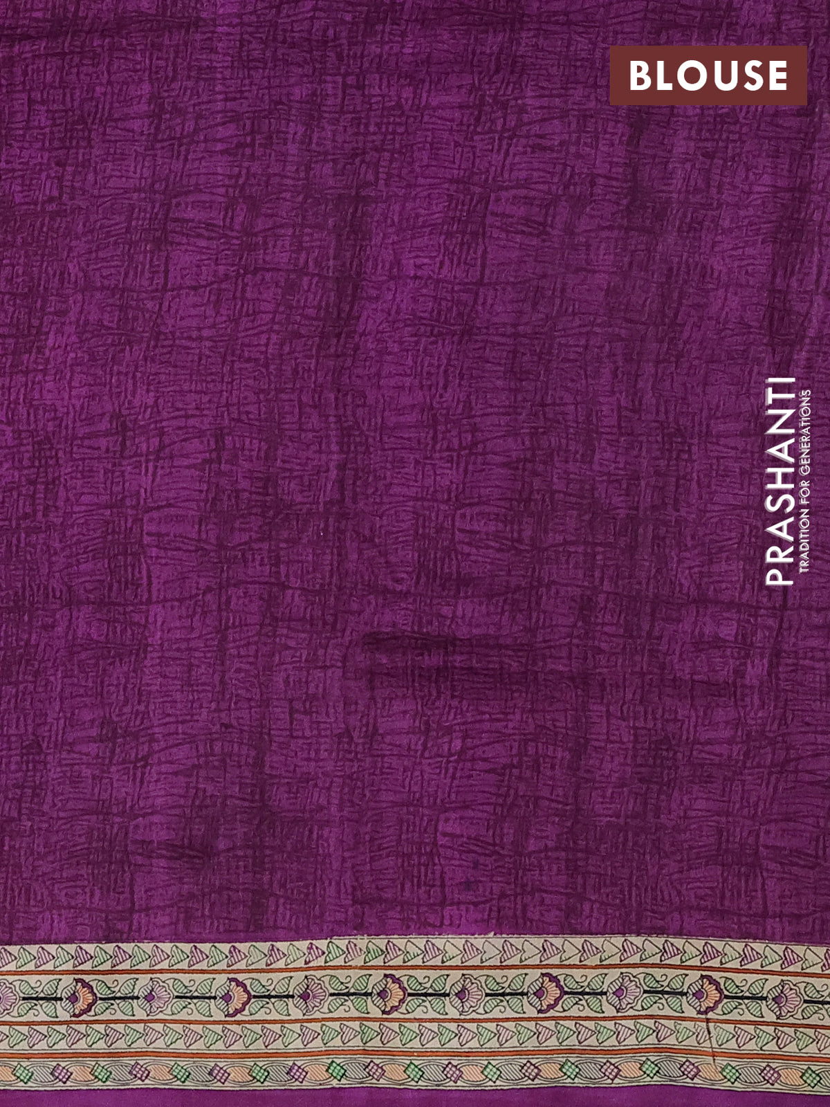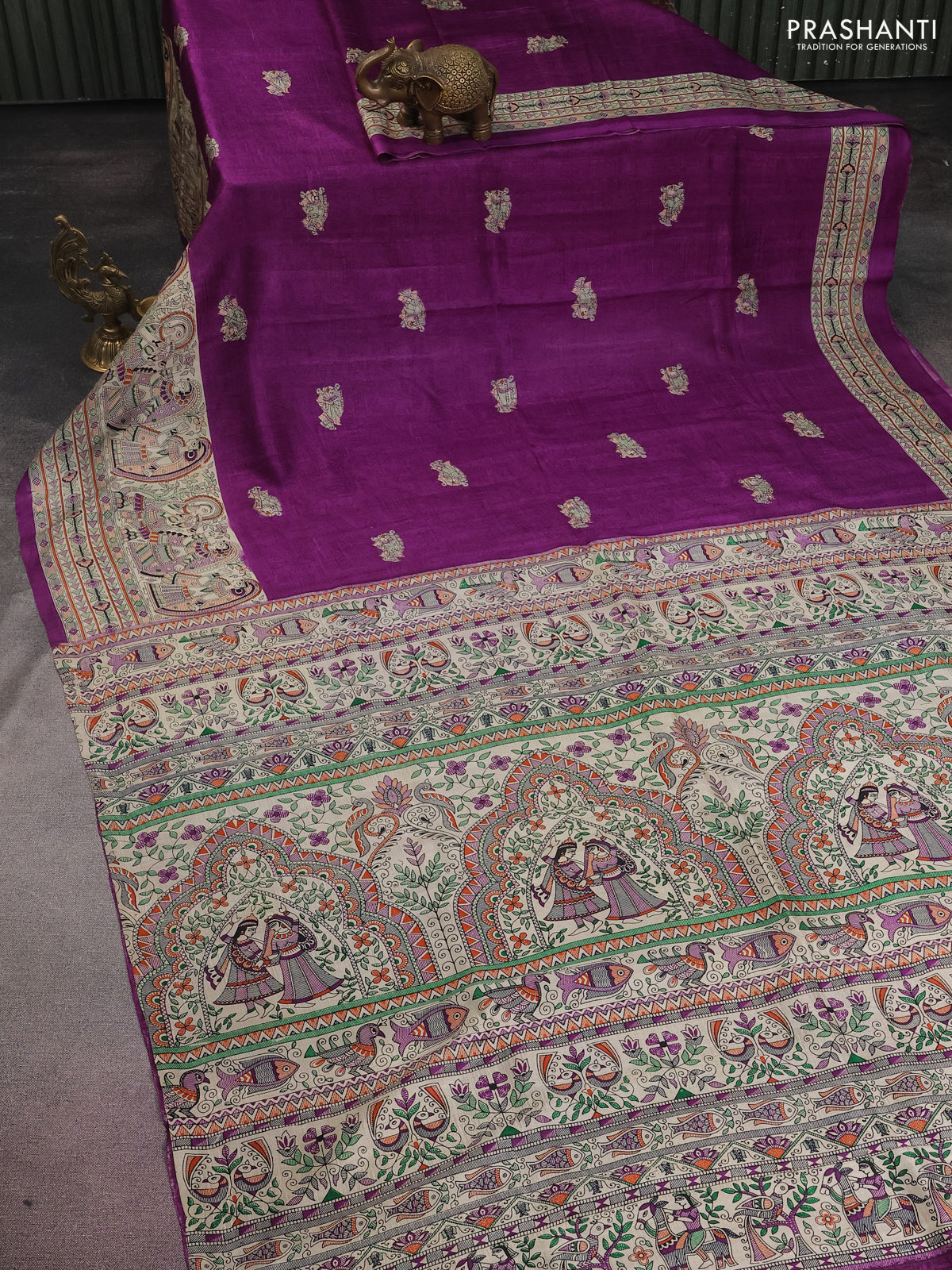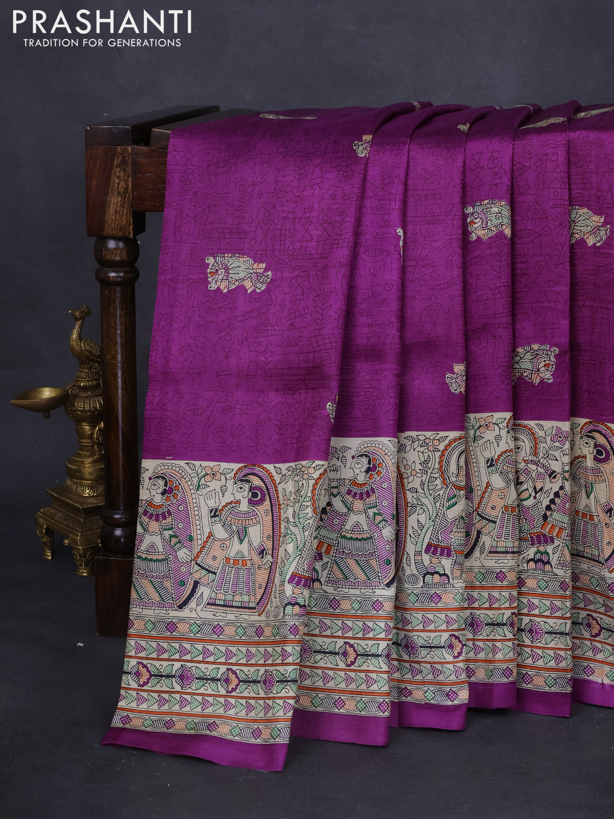 Madhubani printed silk saree purple and cream with allover prints and printed border