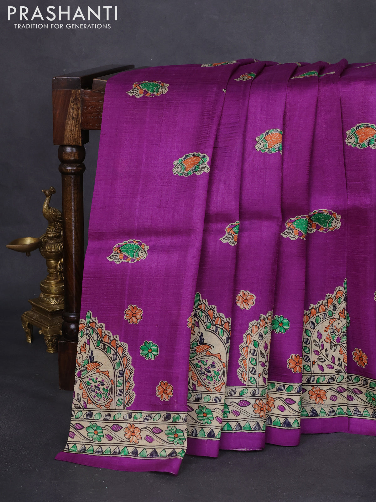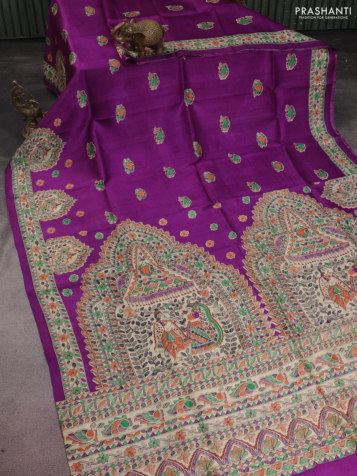 Madhubani printed silk saree purple and cream with butta prints and printed border