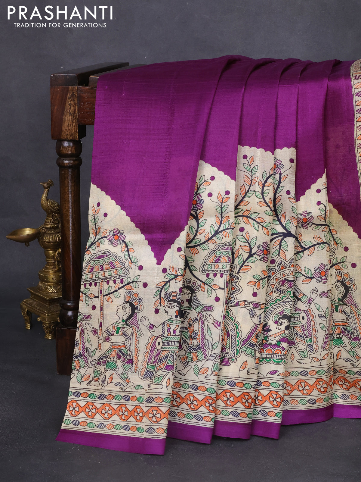 Madhubani printed silk saree purple and cream with plain body and long printed border