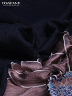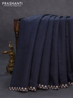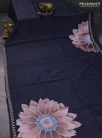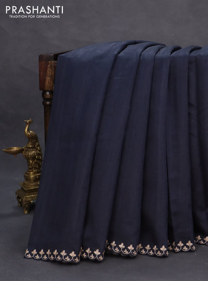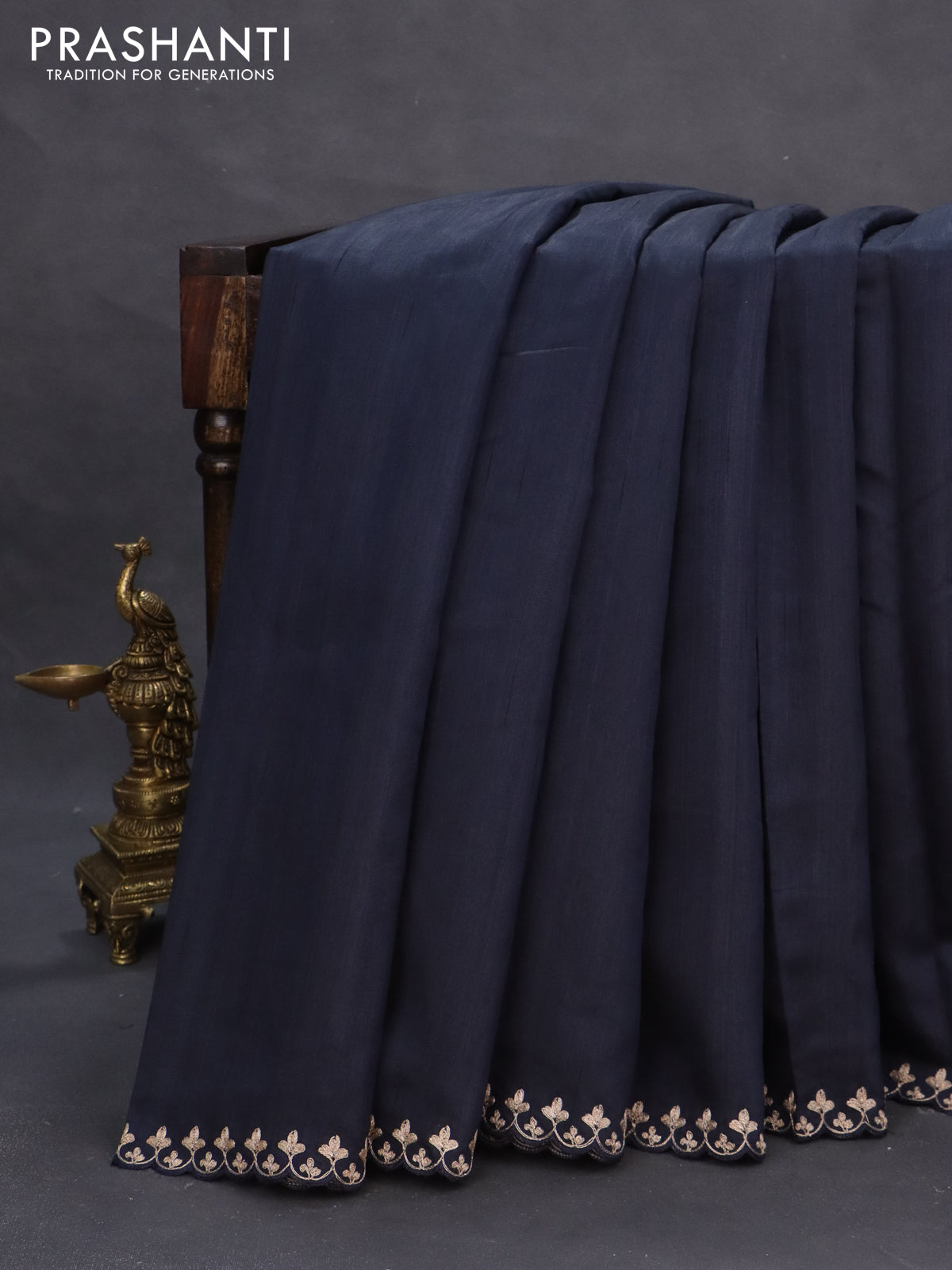 Tussar silk saree deep navy blue with plain body and floral deisgn embroidery work pallu