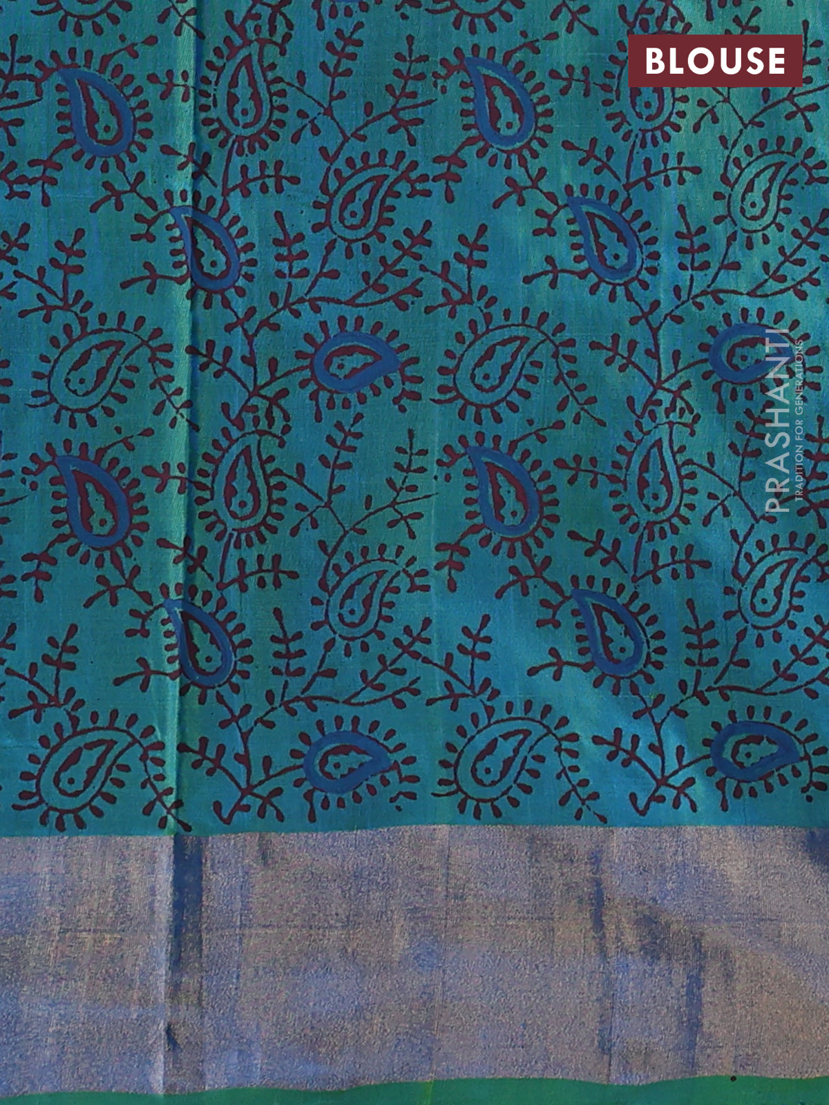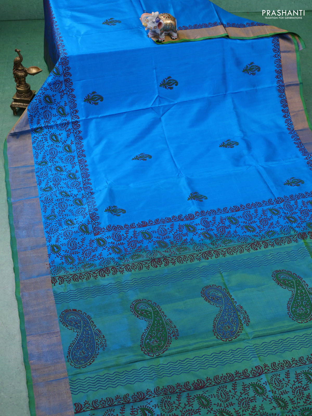 Uppada block printed silk saree cs blue and light green with paisly prints and zari woven border