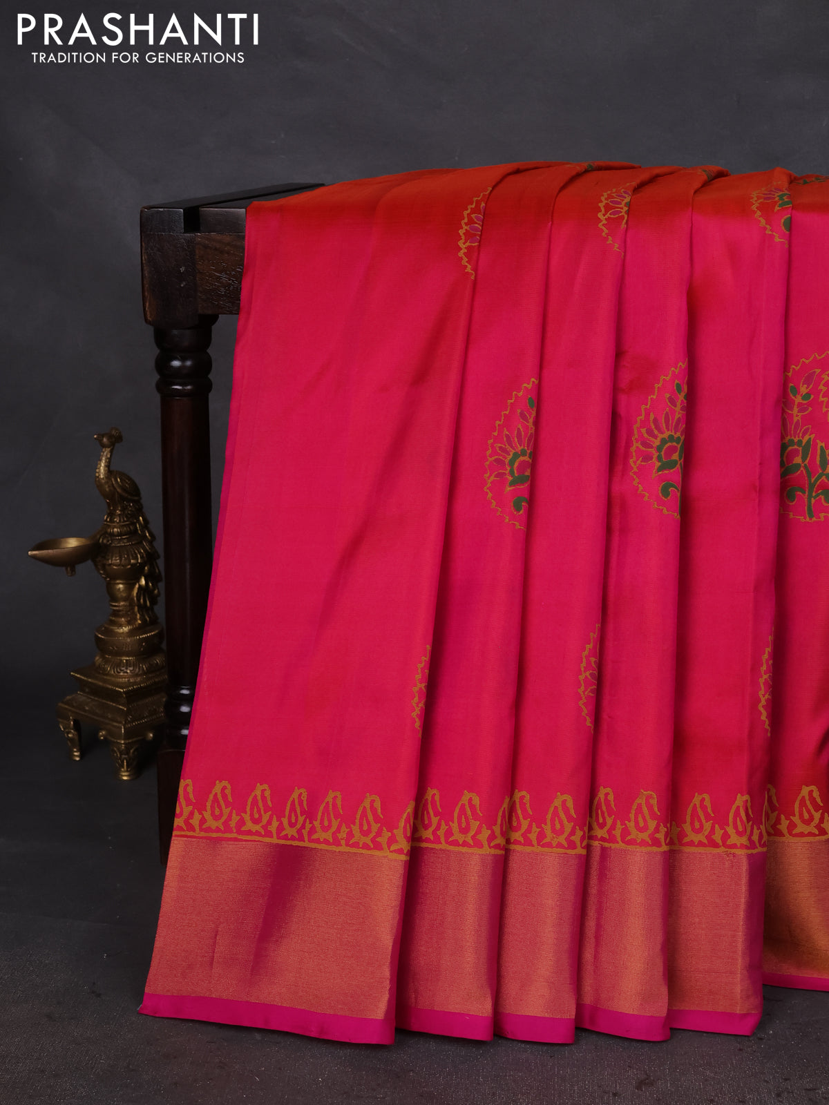 Uppada block printed silk saree dual shade of pinkish orange and pink with butta prints and zari woven border