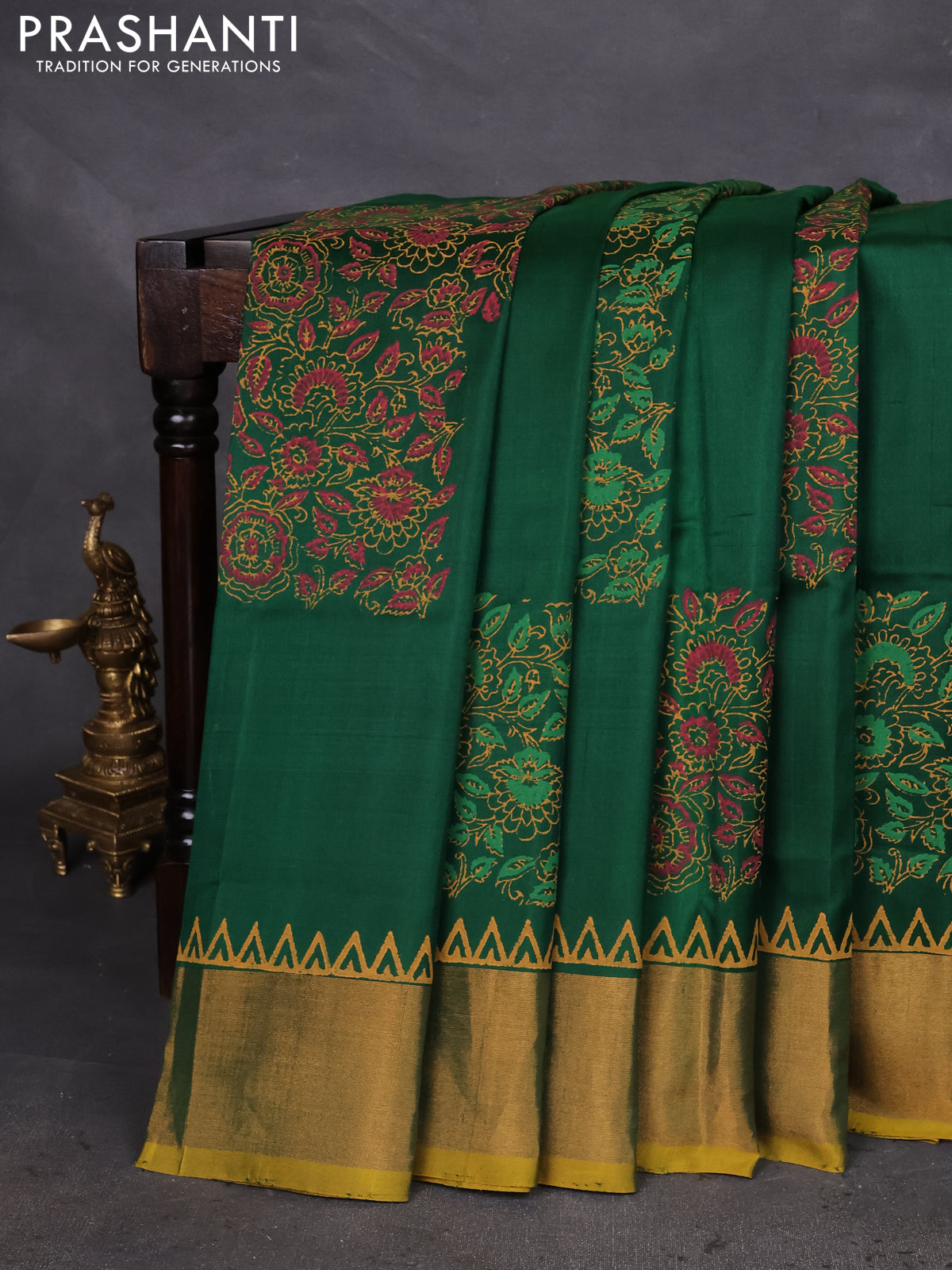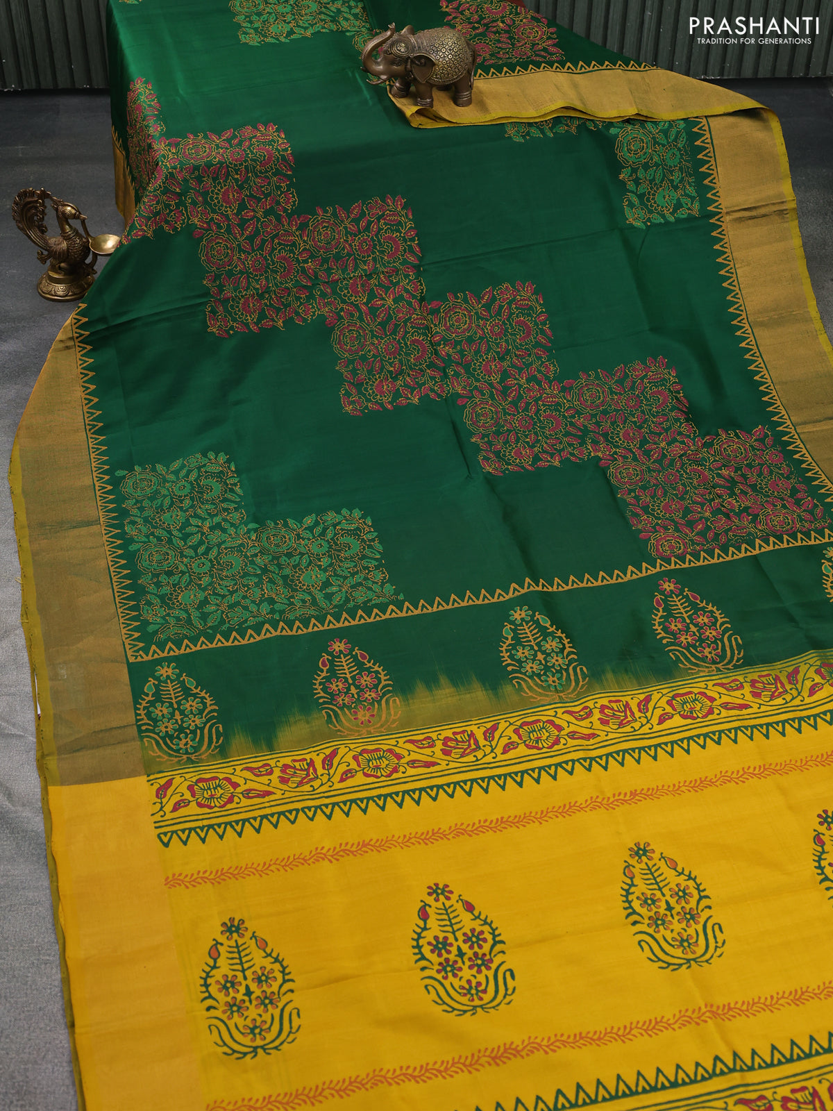 Uppada block printed silk saree green and yellow with floral prints and zari woven border