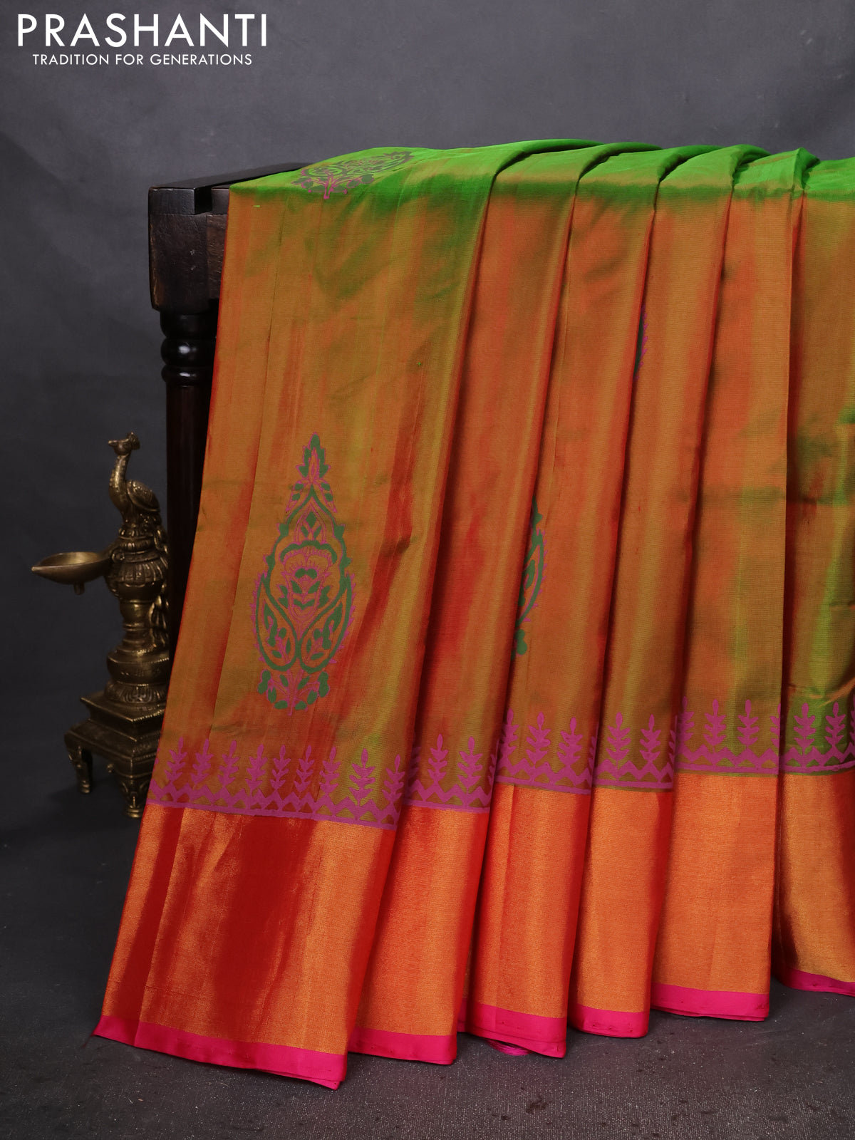Uppada block printed silk saree manthulir green and pink with butta prints and zari woven border