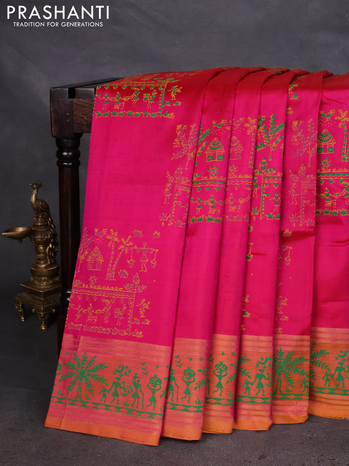 Uppada block printed silk saree pink and dual shade of mustard yellow with allover warli prints and zari woven printed border