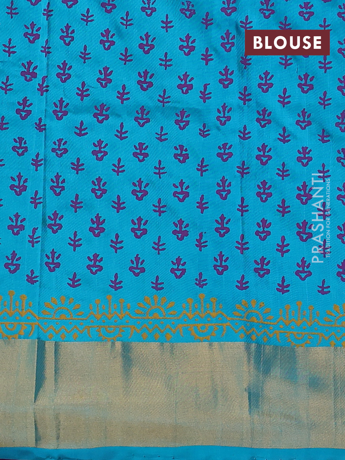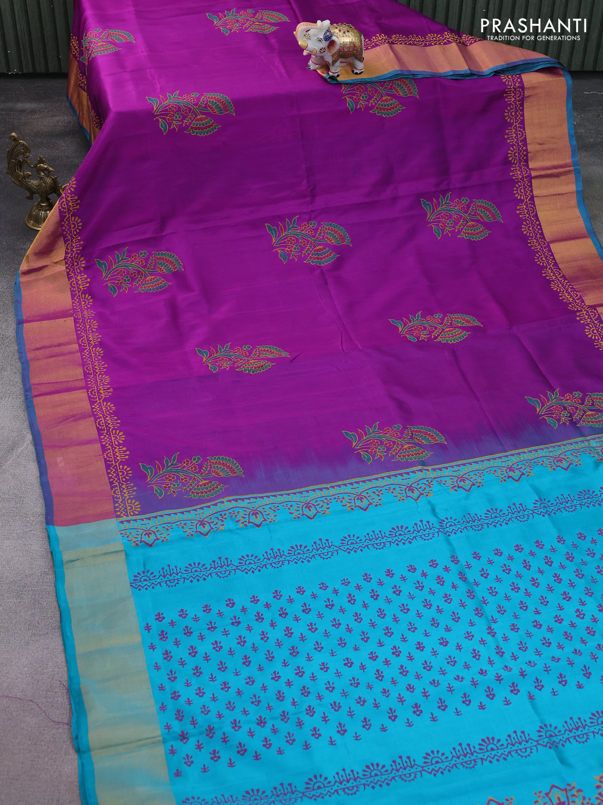 Uppada block printed silk saree purple and teal blue with floral butta prints and zari woven border