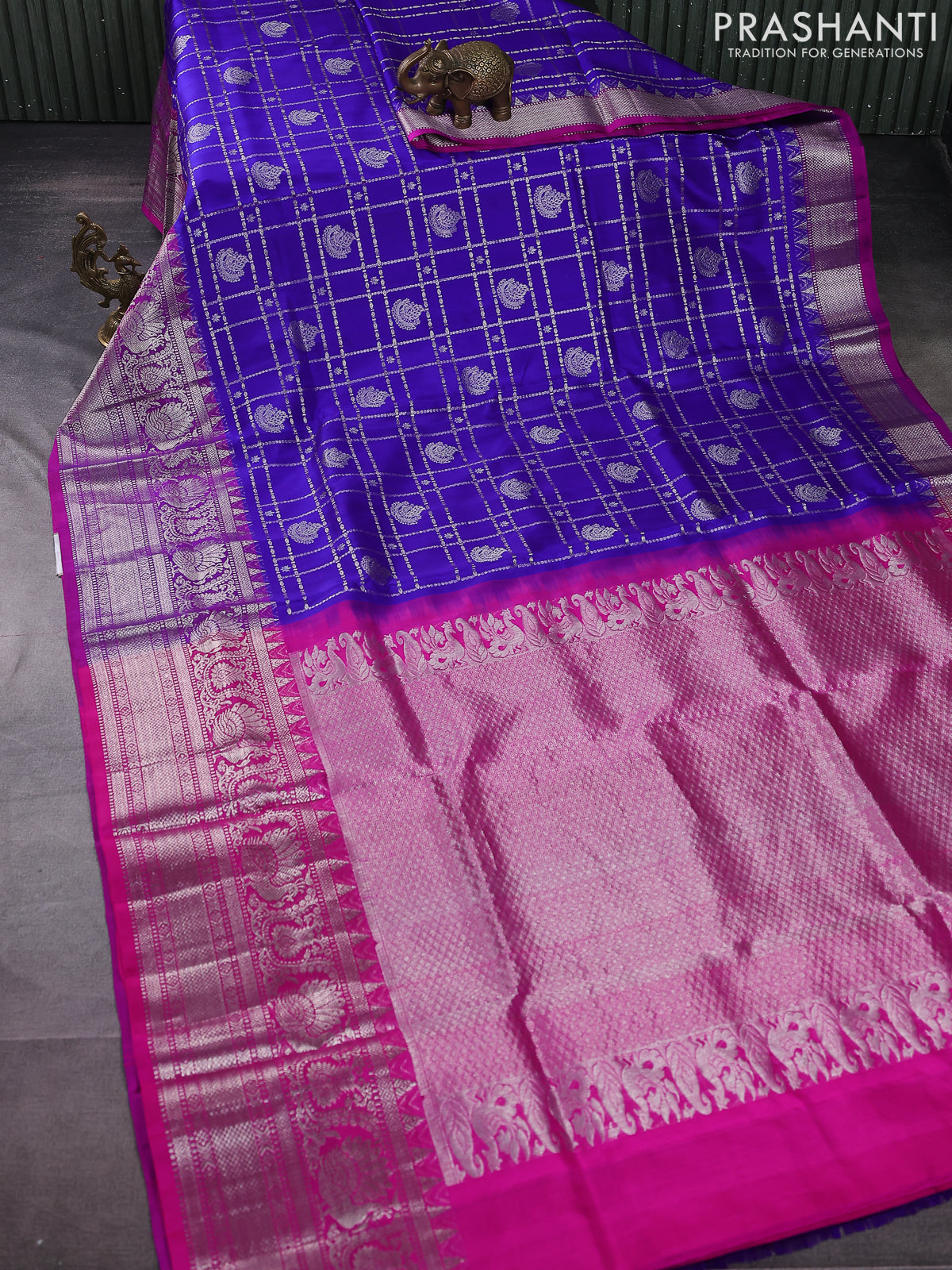 Venkatagiri silk saree blue and purple with allover silver zari checks & buttas and long rich silver zari woven border